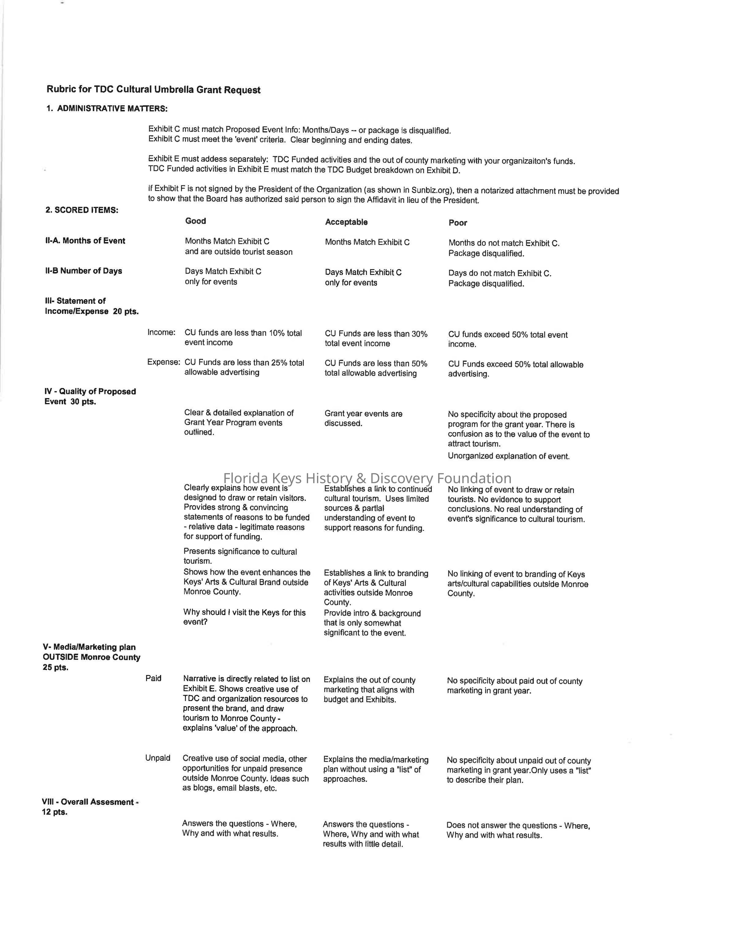 Scoring Rubric for the Monroe County Tourist Development Council's Cultural Umbrella Grant Request. 3 pages are from the Florida Keys Council of the Arts about Promotional Outlets for Cultural Events, Must-Do Tips, and a Press Release Cheat Sheet.