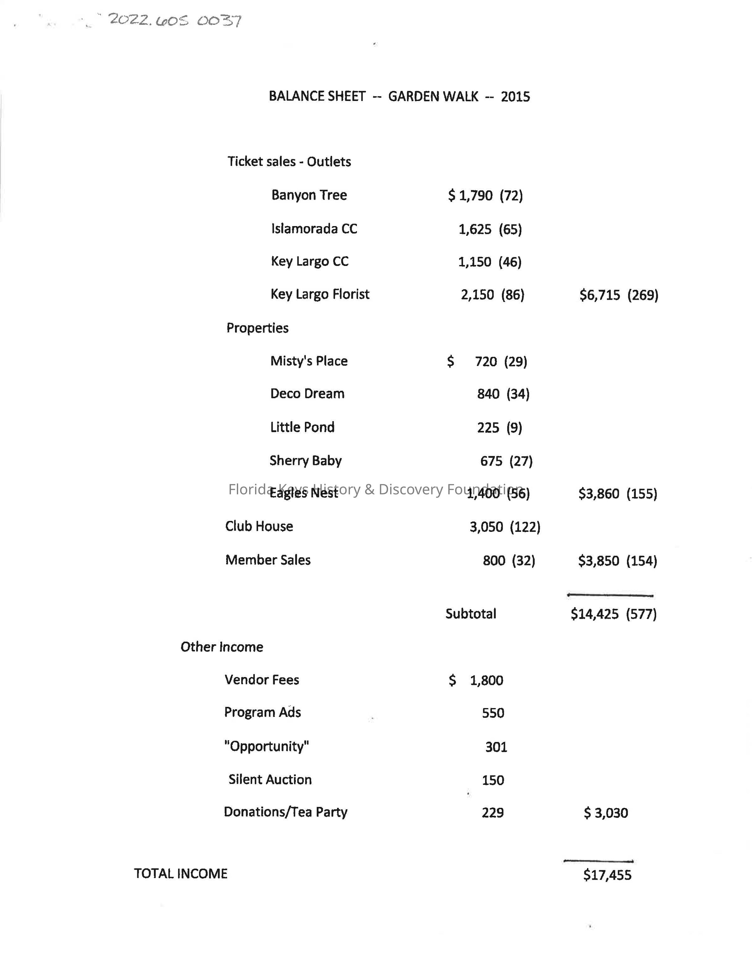 2015 Garden Walk Balance Sheet for the Garden Club of the Upper Keys. Includes income and expenses.