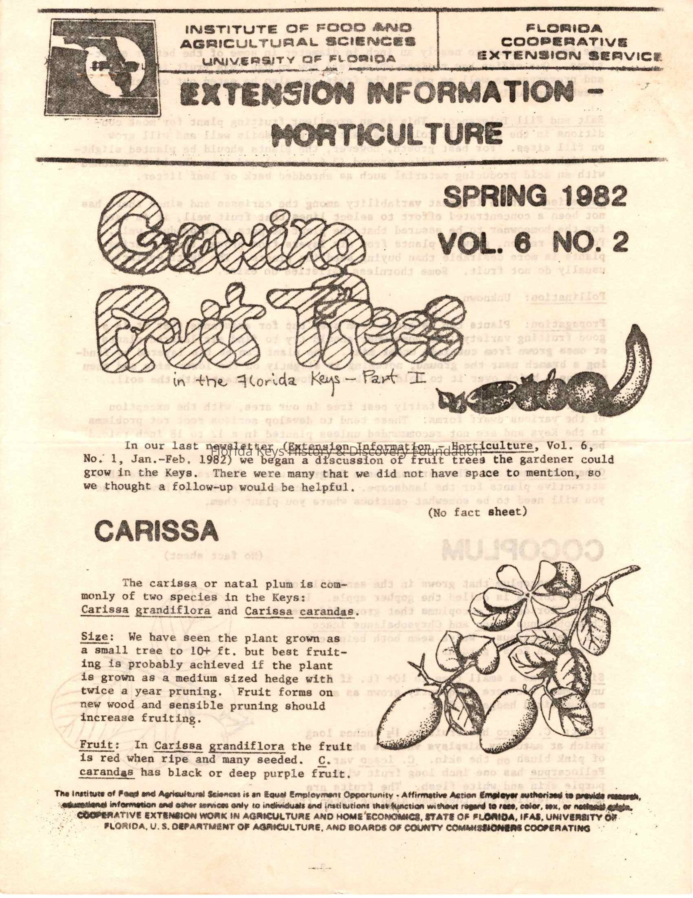 This is the spring 1982 volume of the Extension Information of Horticulture from the Institute of Food and Agricultural Sciences at the University of Florida. This volume covers how to grow and identify fruit trees in the Florida Keys.Collection