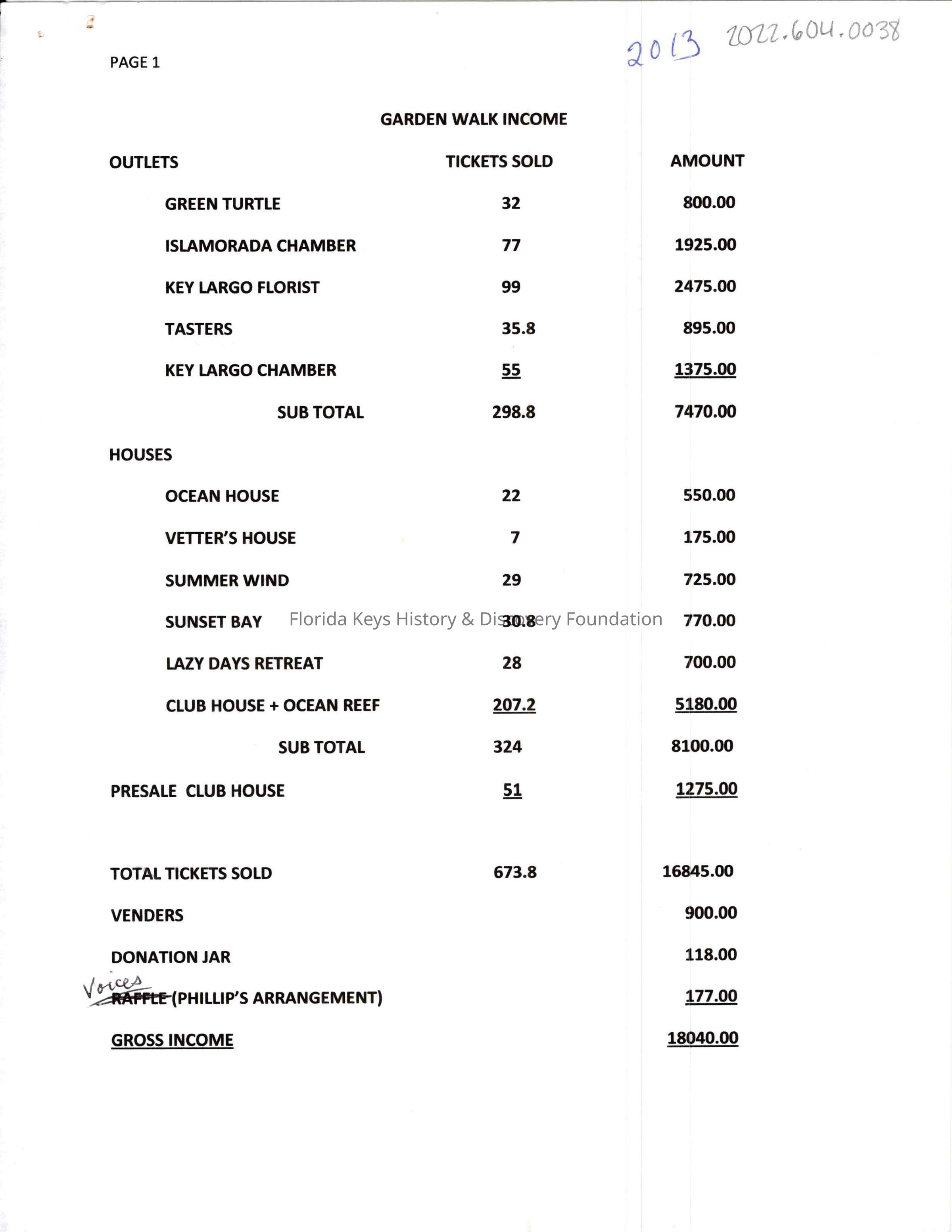 Garden Walk income from 2013. Includes amounts of tickets sold and houses that were visited.