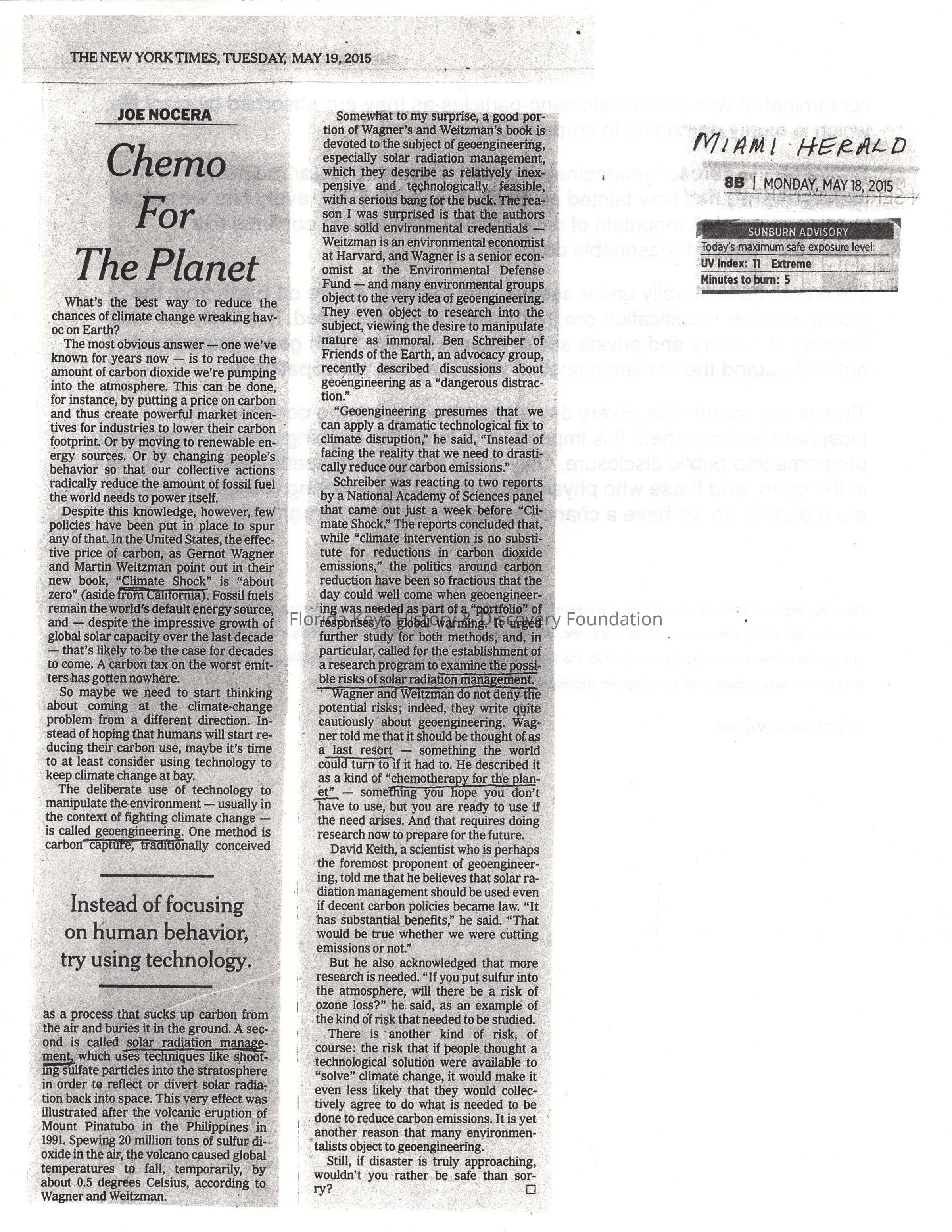 New York Times article from May 19, 2015 entitled "Chemo for the Planet" by Joe Nocera. Newspaper article was clipped and photocopied to be on one page.
