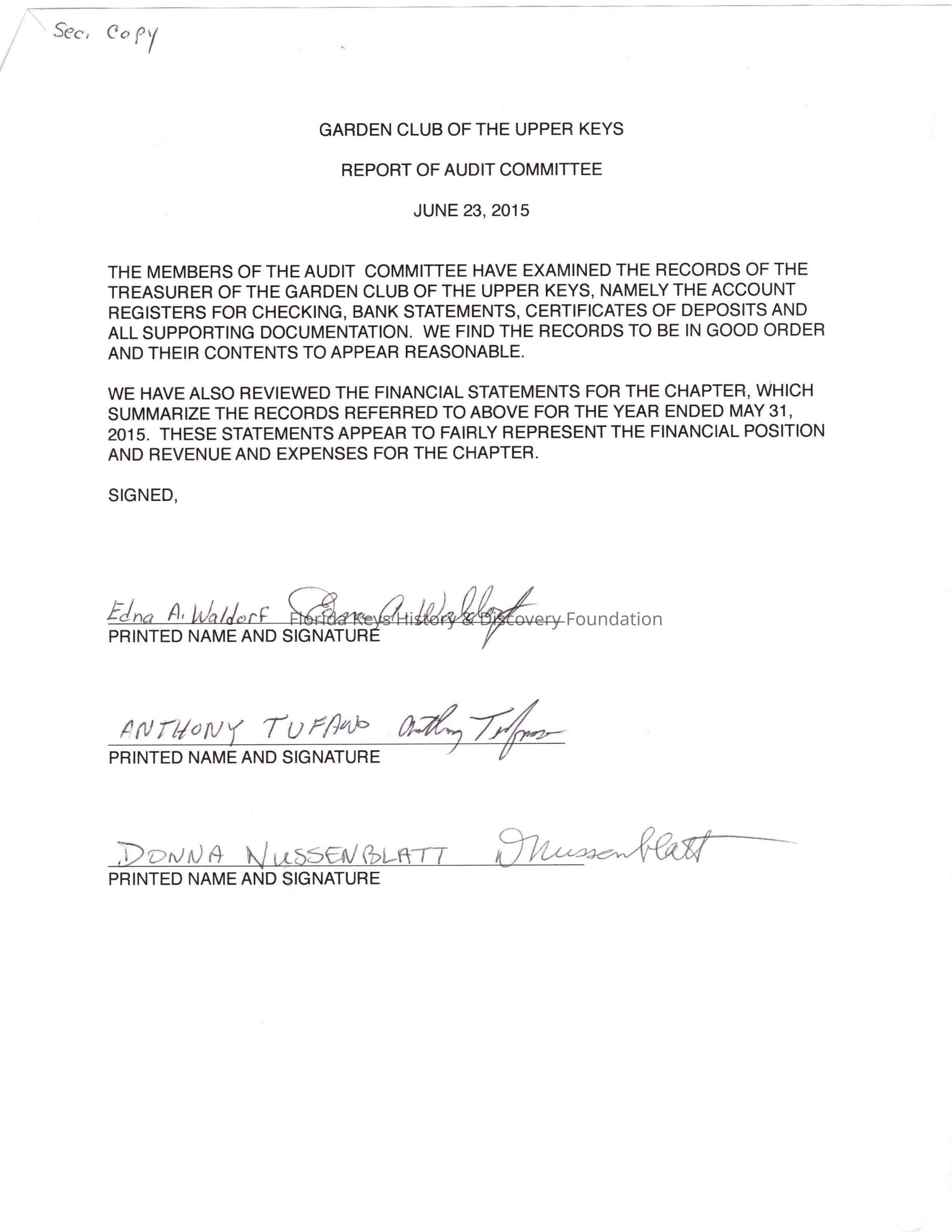 Report from the Audit Committee dated June 23, 2015. They reviewed records of the treasurer and financial statements for the chapter. Signed by Edna Waldorf, Anthony Tufano, and Donna Nussenblatt.