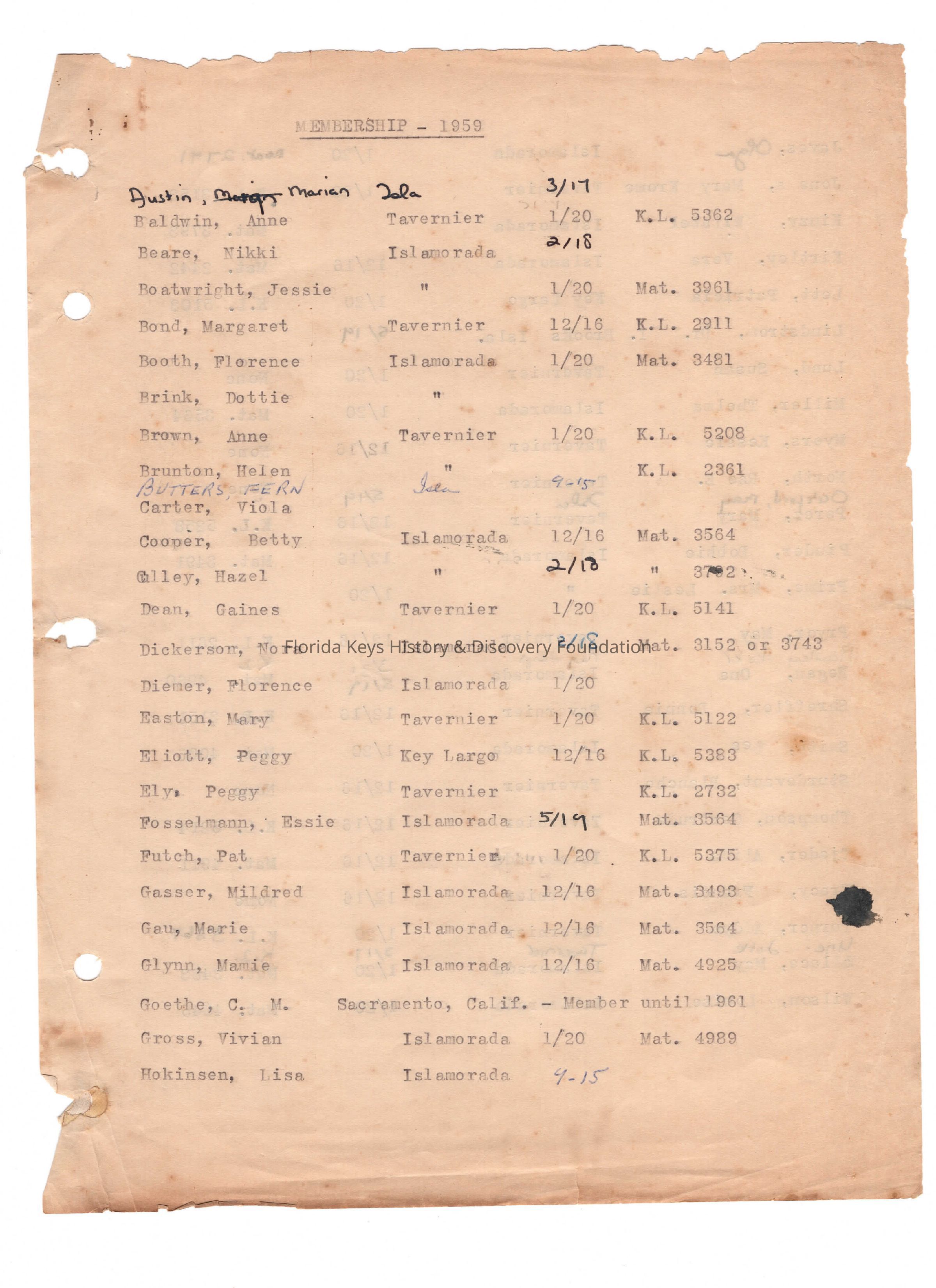 1959 Upper Keys Garden Club Membership ListEntry/Object ID