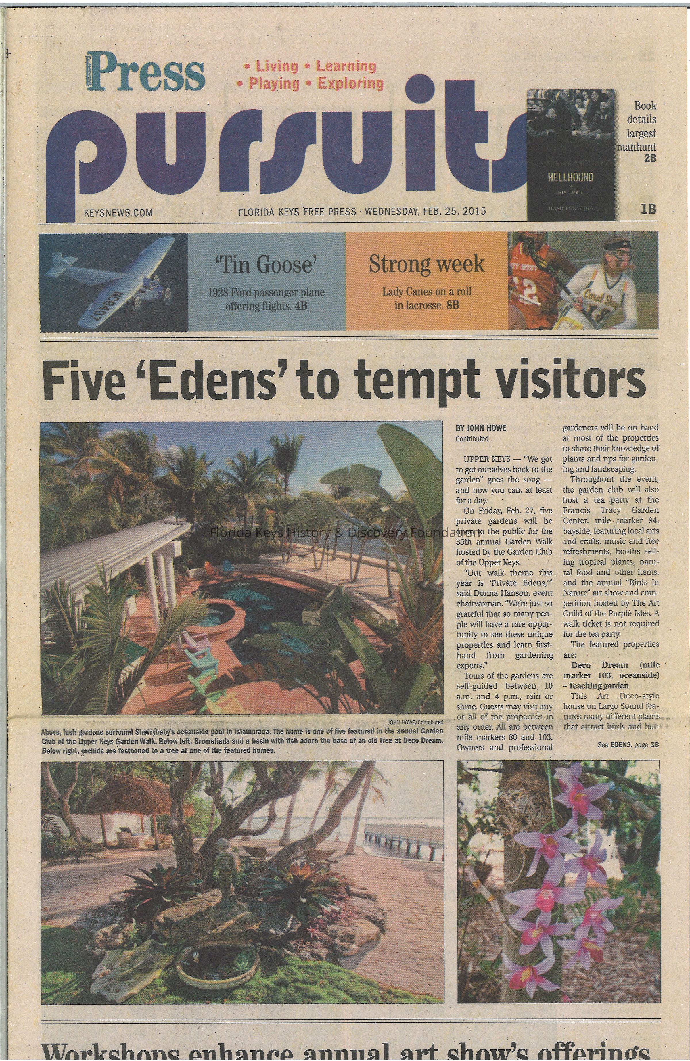 An article of interest for the Garden Club of the Upper Keys is the "Five 'Edens to tempt visitors" by John Howe, on pages 1B and 3B.