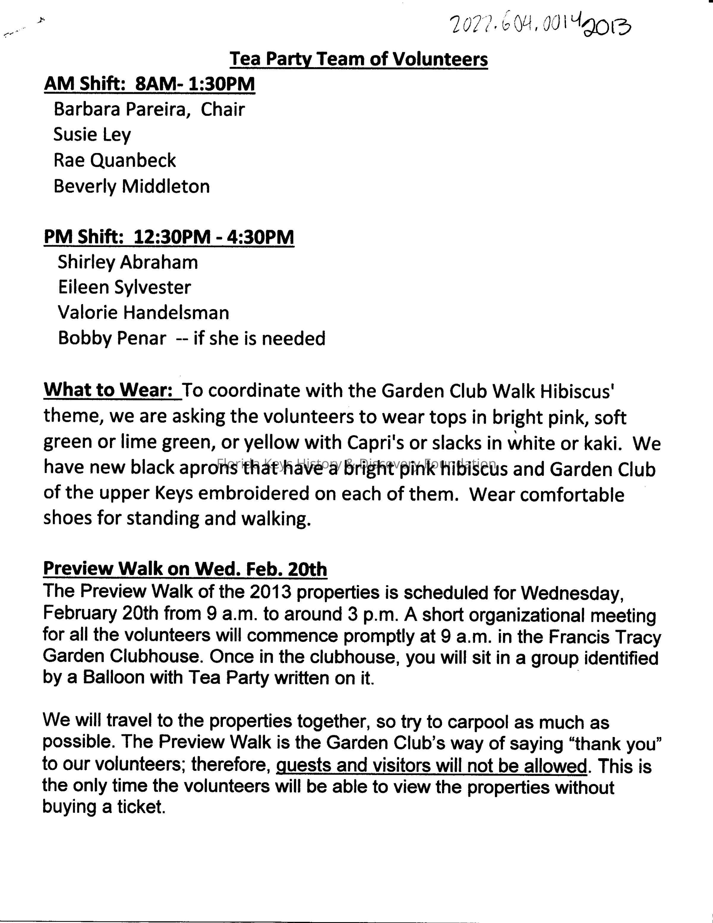 2013 Tea Party documents. Includes lists of names, instructions for Tea Party, and grocery lists.