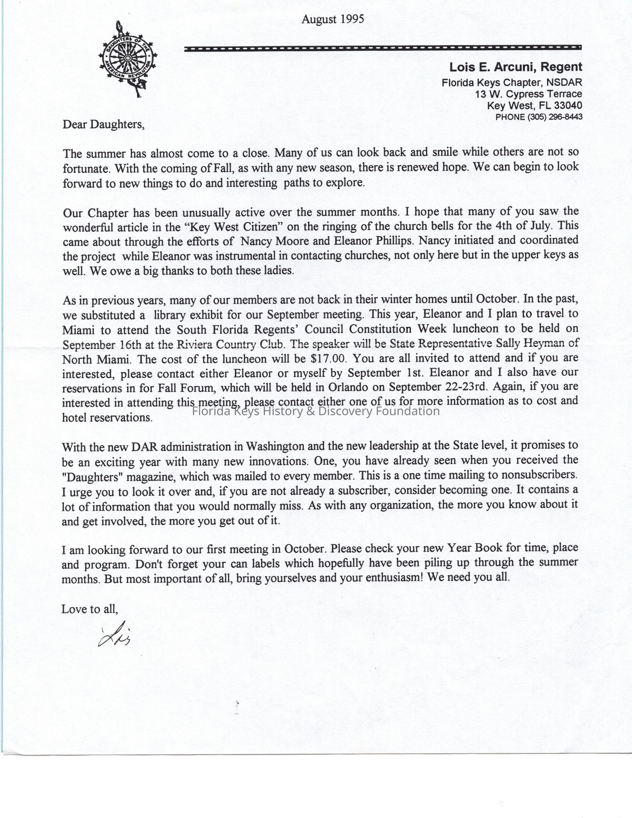 Letter from Regent, Lois E. Arcuni to Chapter Members, 1995Entry/Object ID