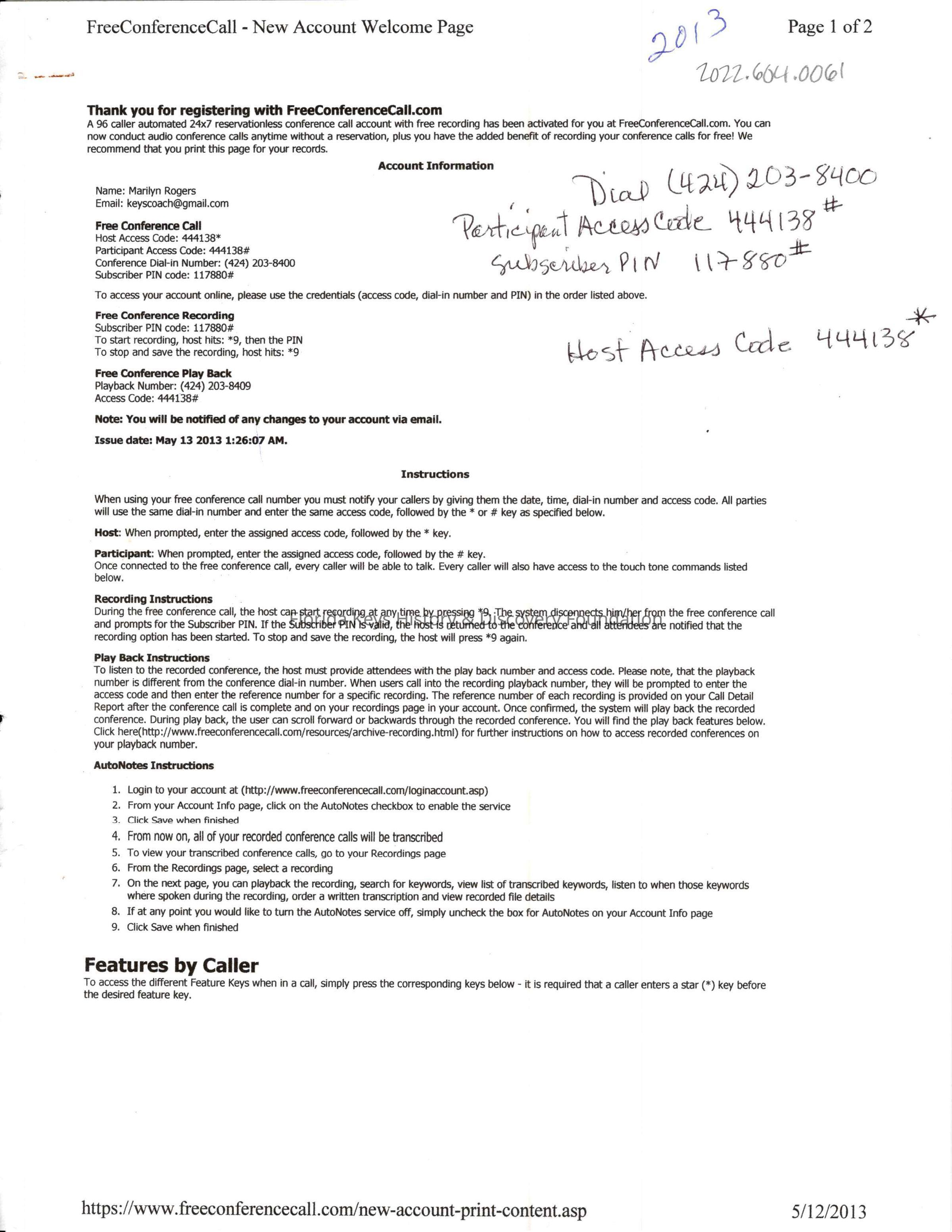 FreeConferenceCall.com RegistrationEntry/Object ID
