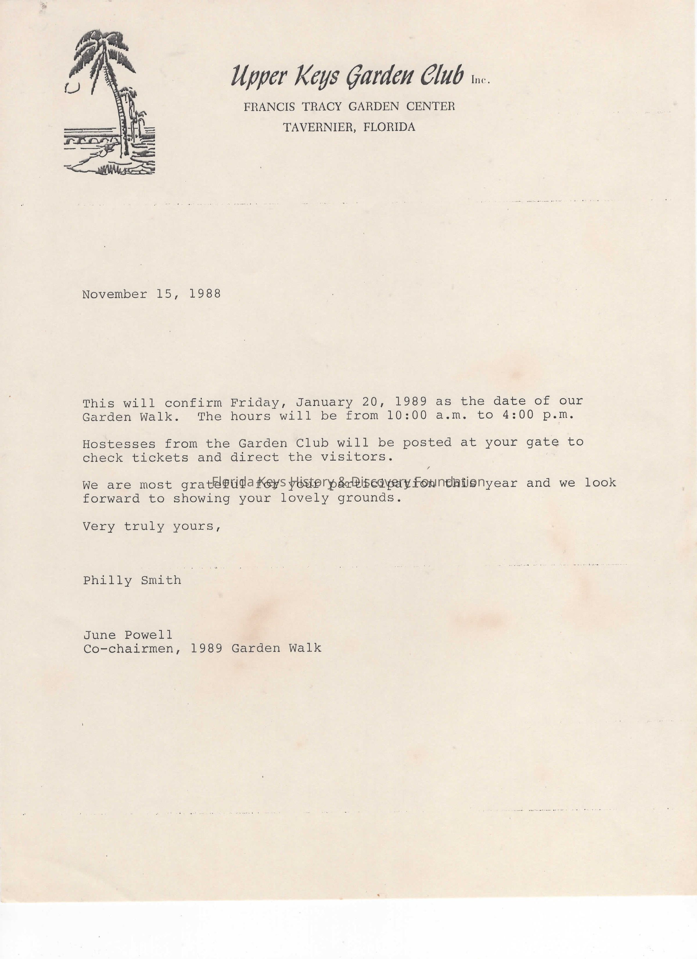 This is a letter written by the Garden Walk chair-people confirming participation.Collection
