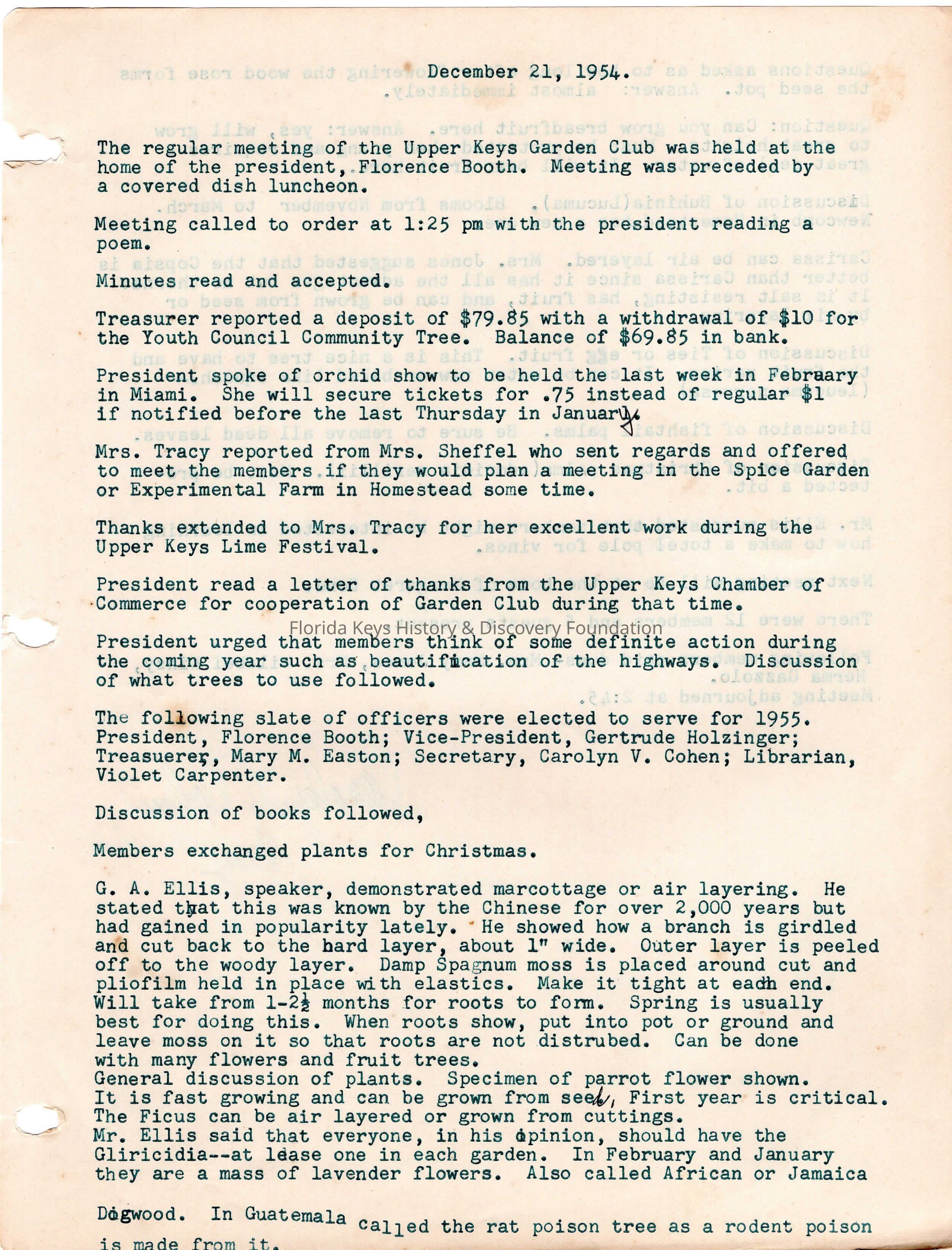 Minutes from club meeting held on December 21st, 1954 at the home of Mrs. Florence Booth.Collection