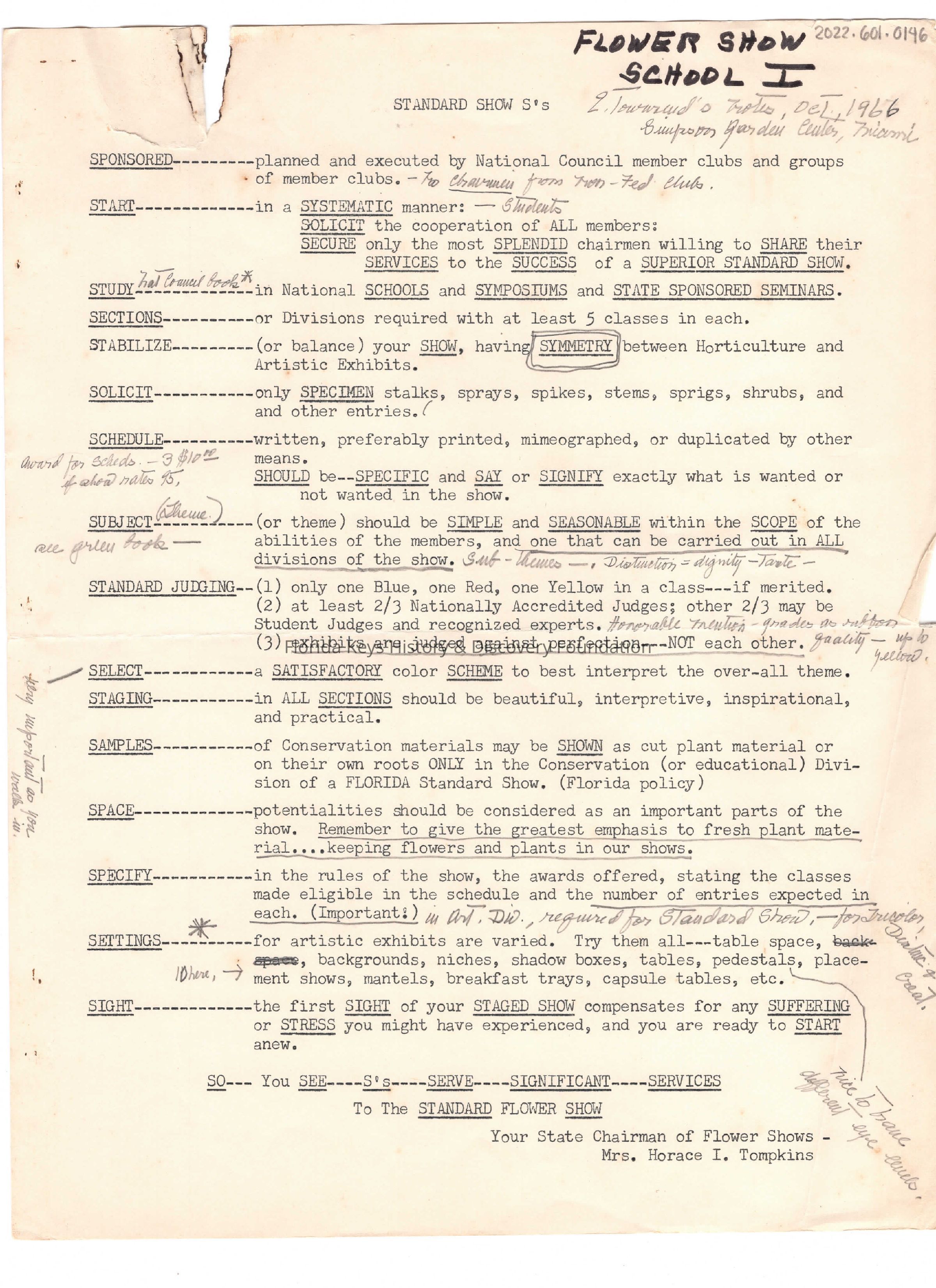 Flower Show Handbook from October 18th, 19th, and 20th, 1966. Set standards for Flower Show's. Study sheet for Flower Show practices. Flower arrangement course handout. Basic designs for flower arrangements. Study sheet for for horticulture course.Collection