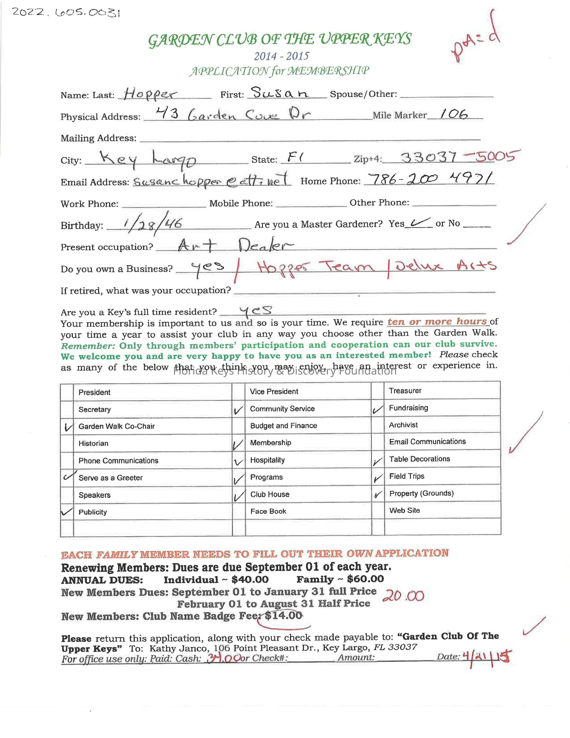 2 GCUK Membership Applications, for Susan Hopper and Julia Hahn. Applications appear to be edited by a club member to mark "Paid" and more information about the member.