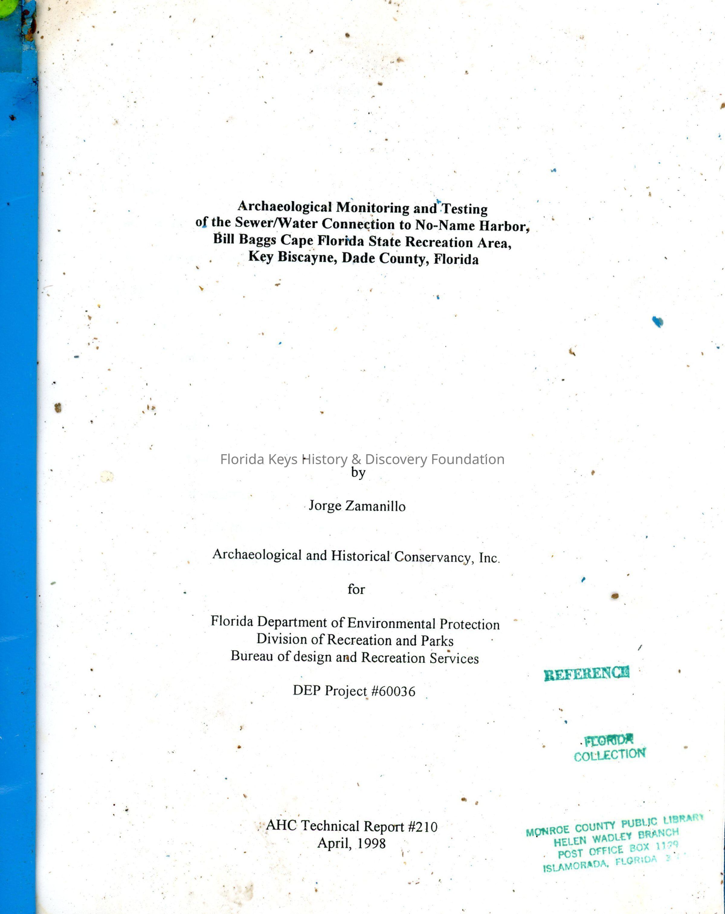Archaeological Monitoring and Testing of the Sewer/Water Connection to No-Name Harbor, Bill Baggs Cape Florida State Recreation Area, Key Biscayne, Dade County, FloridaEntry/Object ID