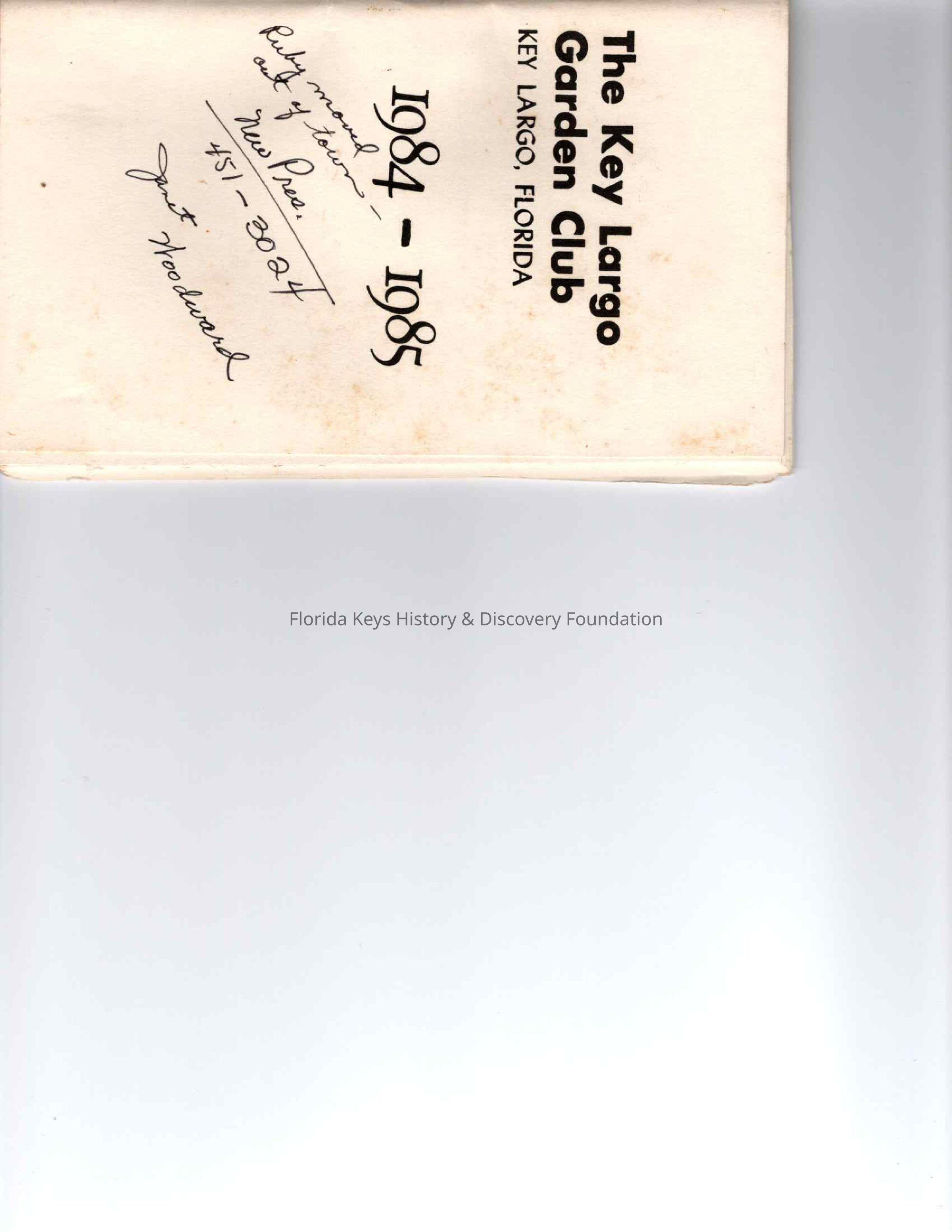 This book contains a calendar of events held by the club from 1984-1985. This includes a description of the events and the officers of the time. The Key Largo Garden Club is the retired name for the Garden Club of the Upper Keys from 1954 back. However, this appears to be an independent organization.Collection