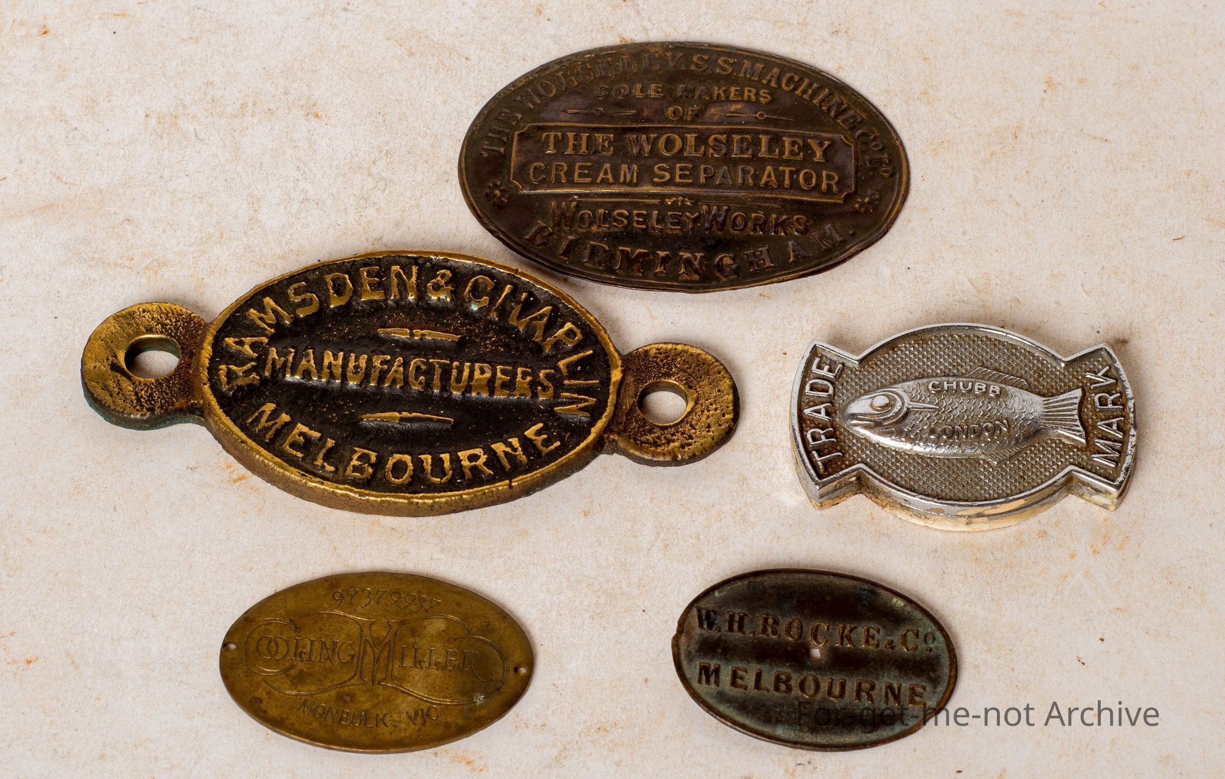 5 pieces relating to advertising. The first piece is the keyhole cover for a chub safe, in it, the trade symbol of a fish. The second piece is, w h rock Melbourne stamped on an oval piece of copper. The next one is, from Wolseley Sheep Shearing Machine Company, the Wolseley Cream Separator, Birmingham, England. The next one is a cast brass piece from Marsden Chaplin Manufacturers Melbourne. The last piece is Collin Miller, Monbulk, Victoria with a phone number on the topCollection