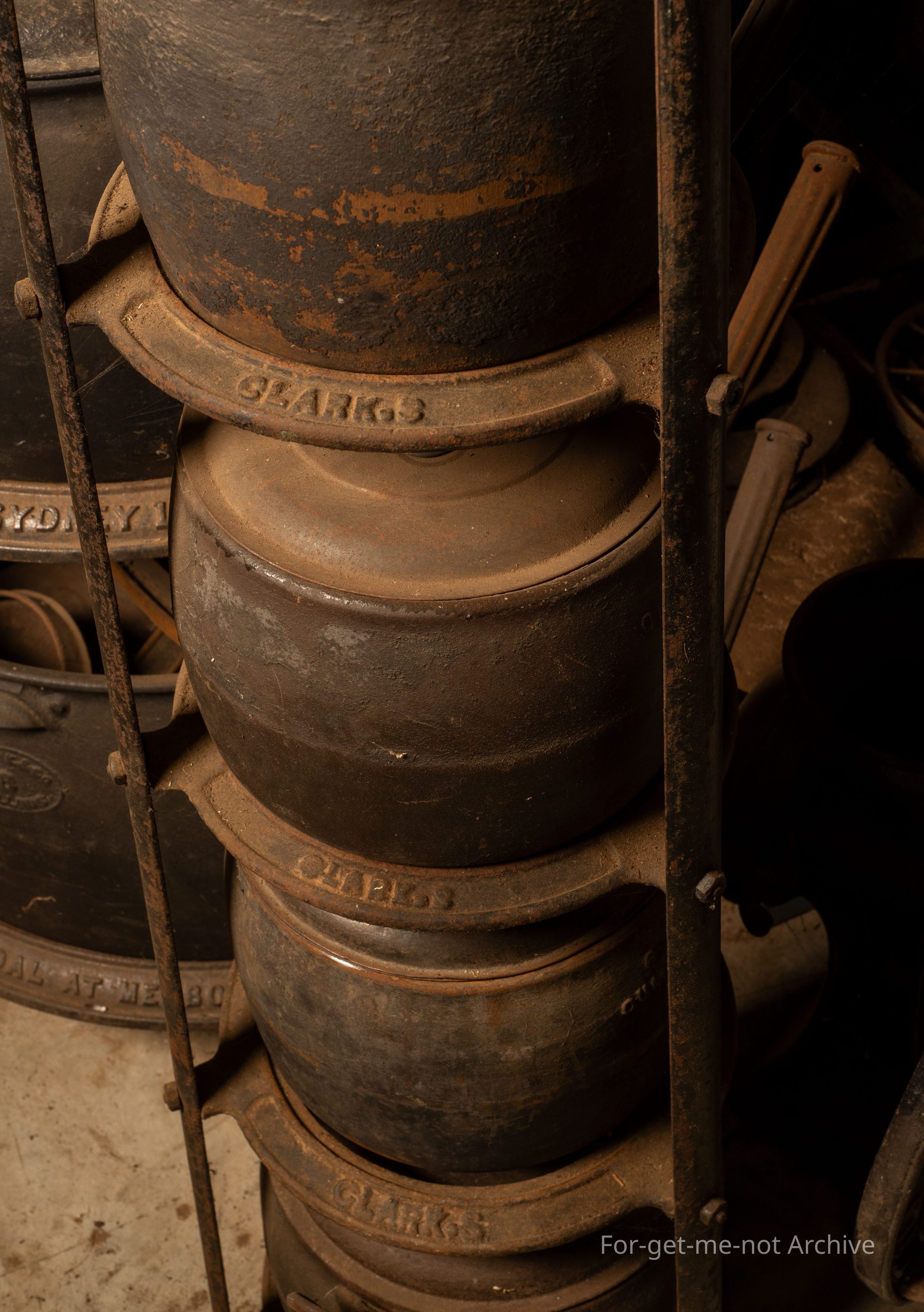 this is a Clark, saucepan stand from top to bottom with original Clark Pots of all the right sizes and very good condition with the description of each size on each ring from top to bottom.Collection