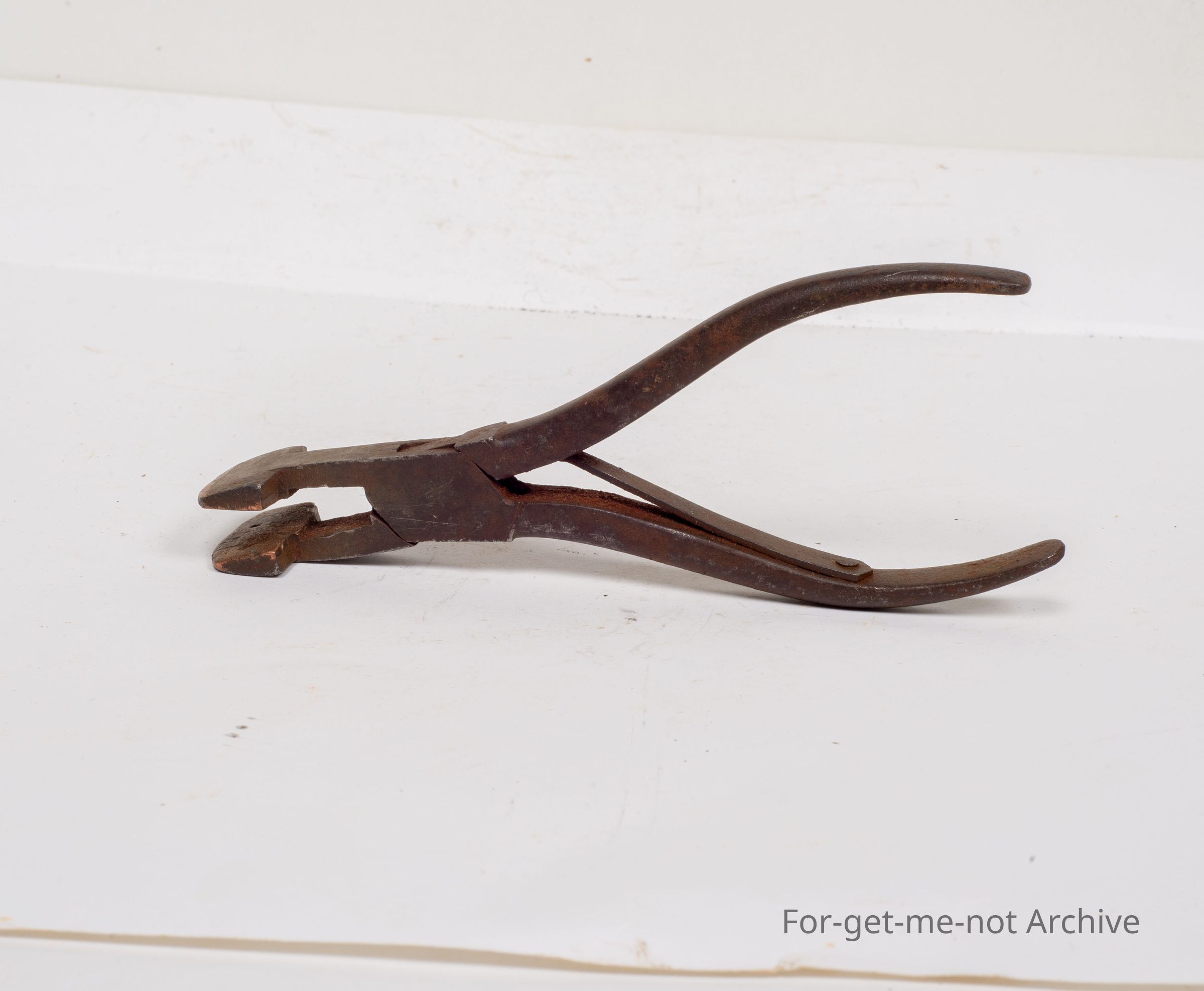 This is another unusual tool, similar to pliers with flat ends which are, embedded with copper and these are powder monkeys pliers for squashing the lead into the fuse so there will be no sparks with the copper end. Quite a hard tool to find. Not easily recognized.Collection