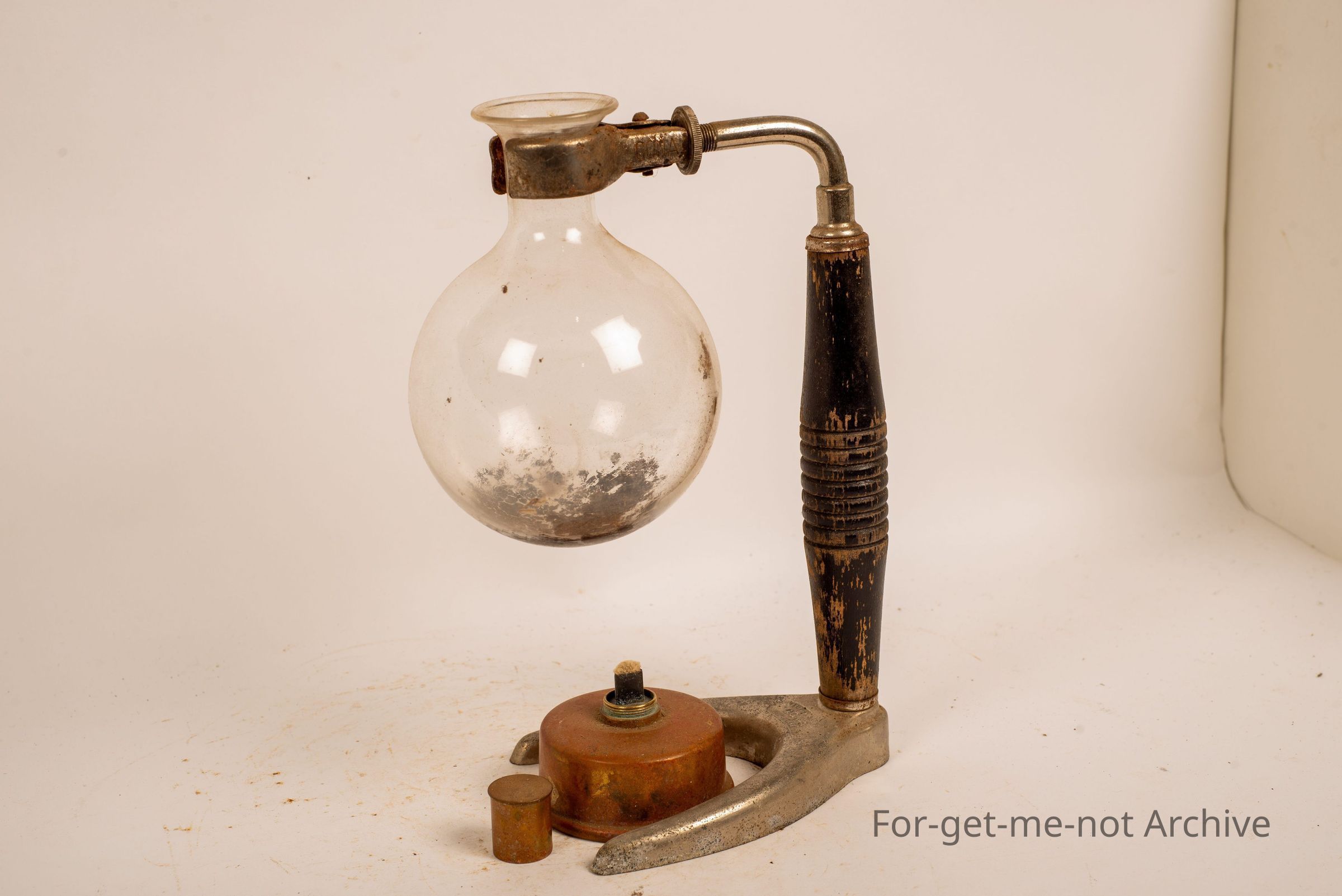 Glass coffee percolator with burner, wooden handle, lid for burner, incomplete.