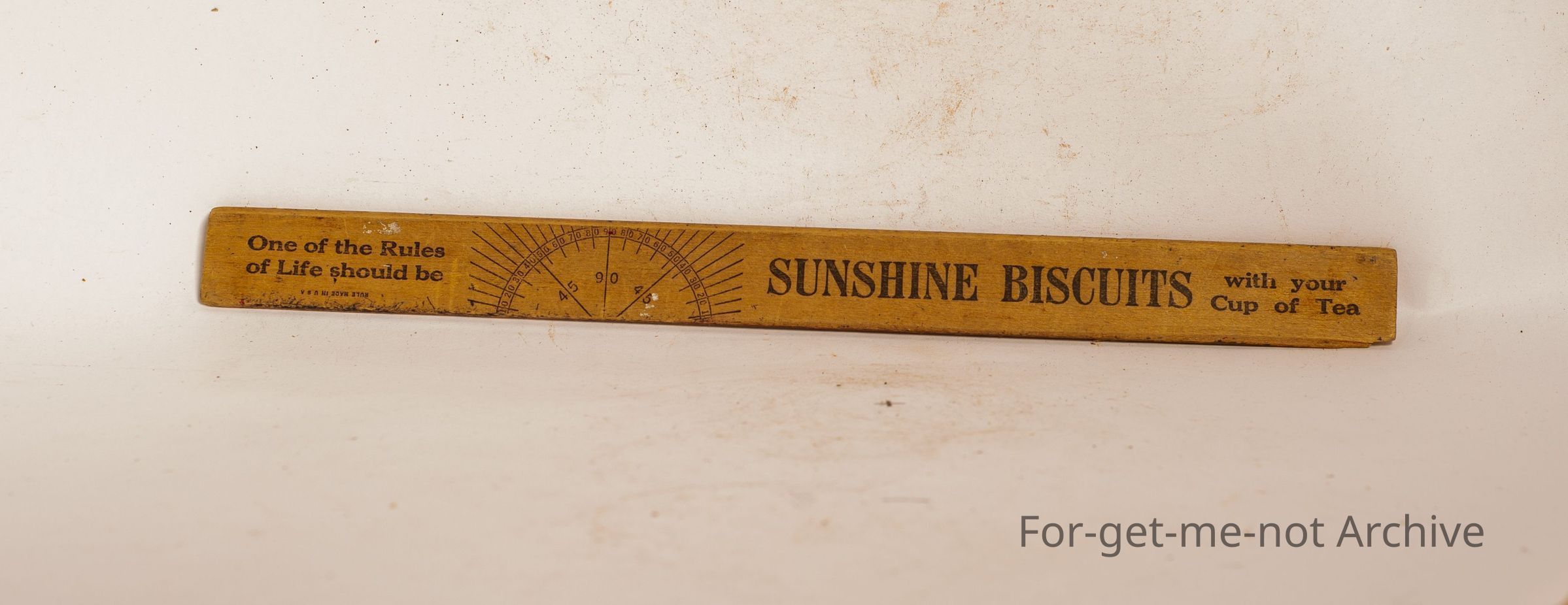 Wooden Ruler Advertising Sunshine Biscuits, Ballarat. Opposite side, Sunshine Biscuits with your cup of tea.