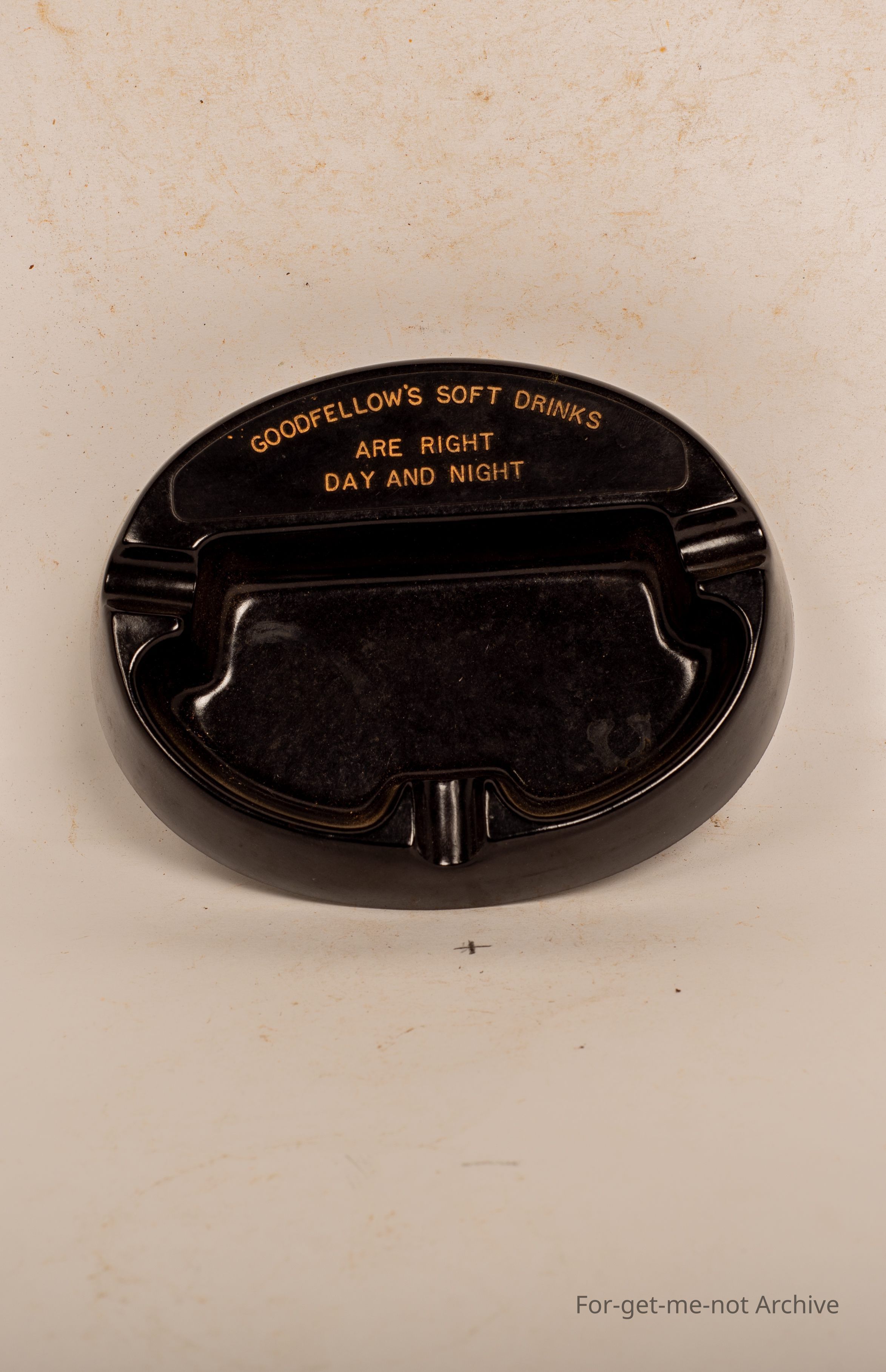 Bakelite Ashtray advertising Goodfellows soft drinks. "We are right day and Night" with a cast Goodfellow's Crown Seal bottle opener in very good condition.