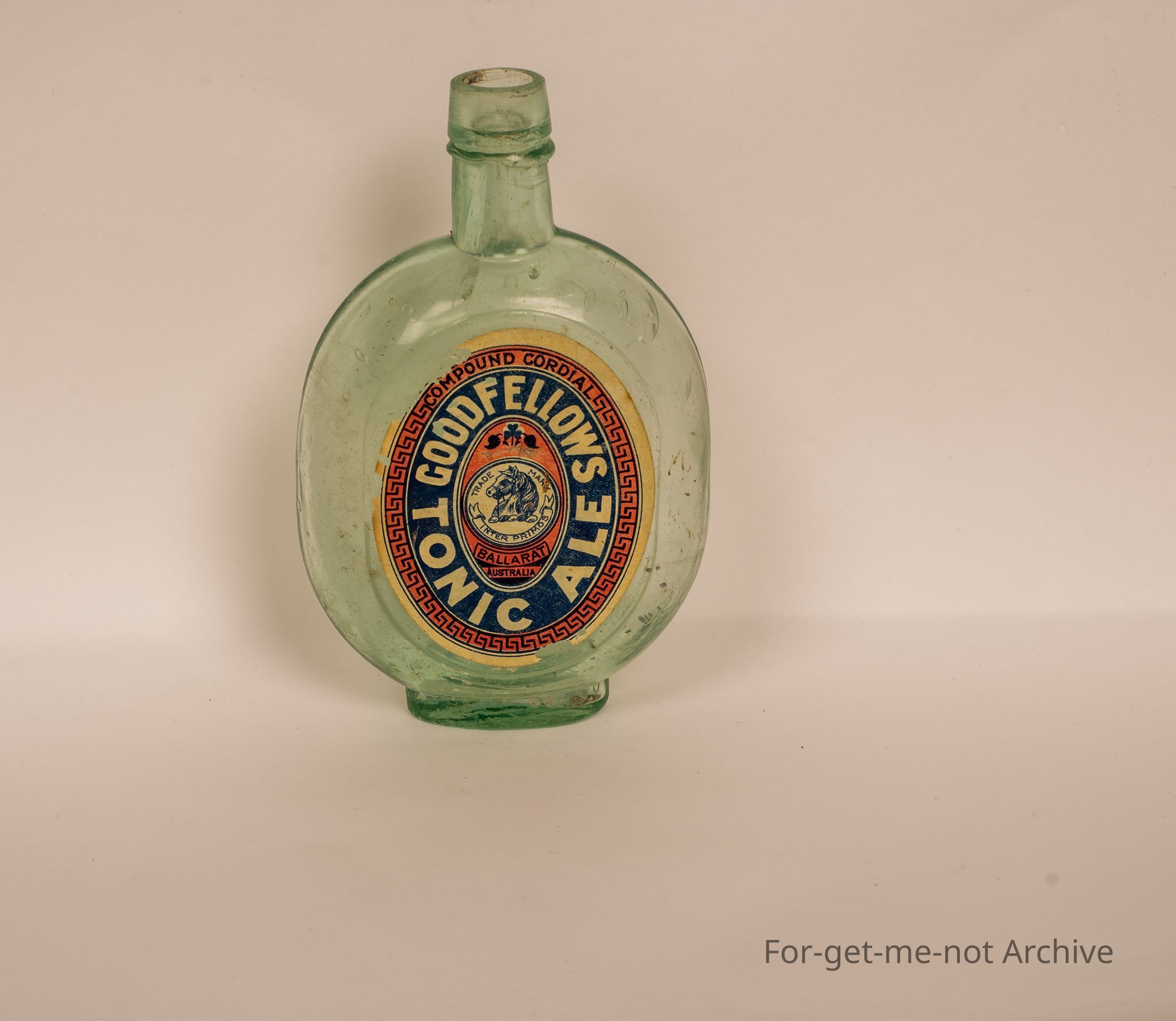 A squat, round but flat bottle, Goodfellow's Tonic Ale, compound cordial. Image of horse on paper label