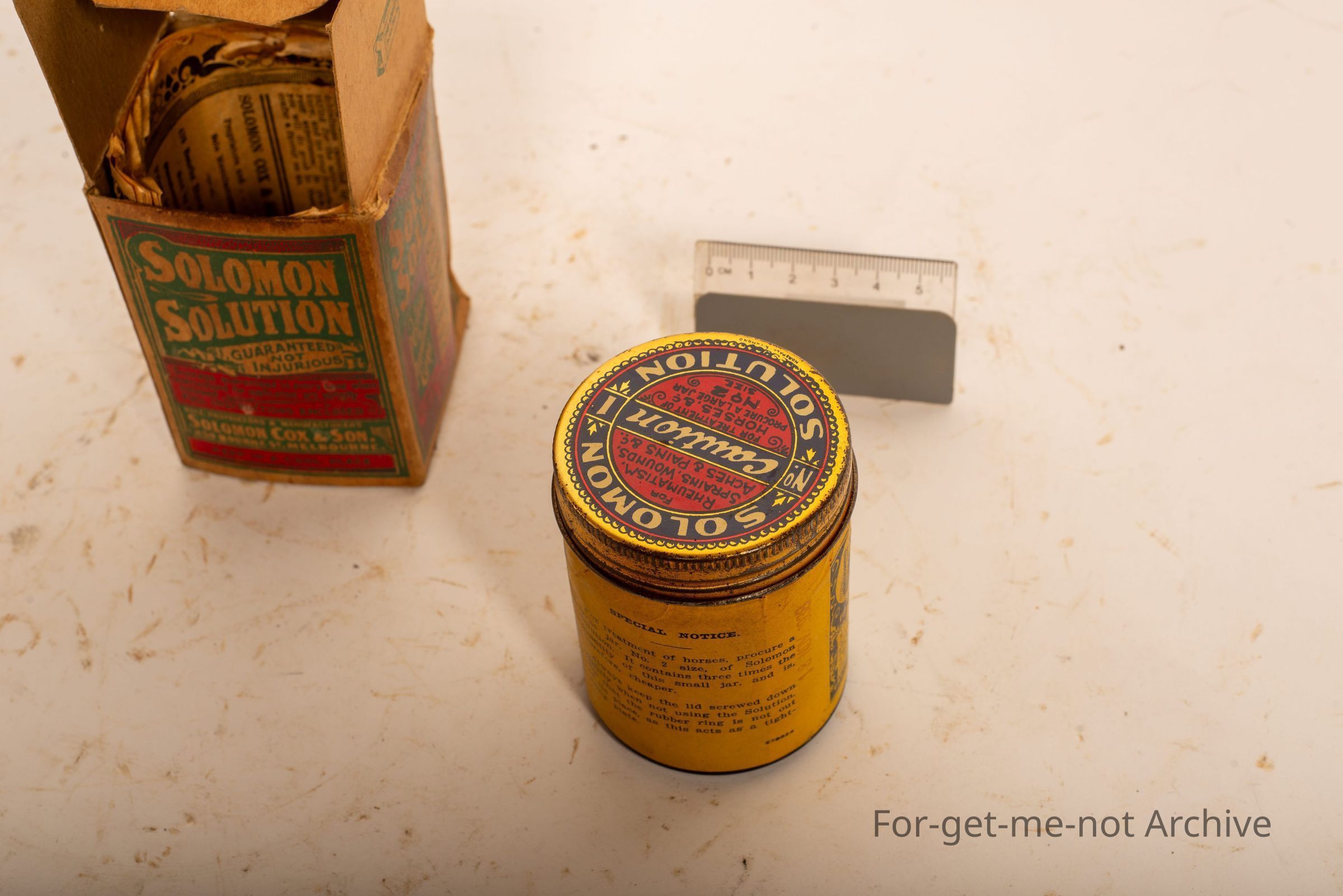 this is the packaging box for Solomon's solution. This has the full content bottle and the instructions all involved, in lovely condition, an early animal treatment.Collection