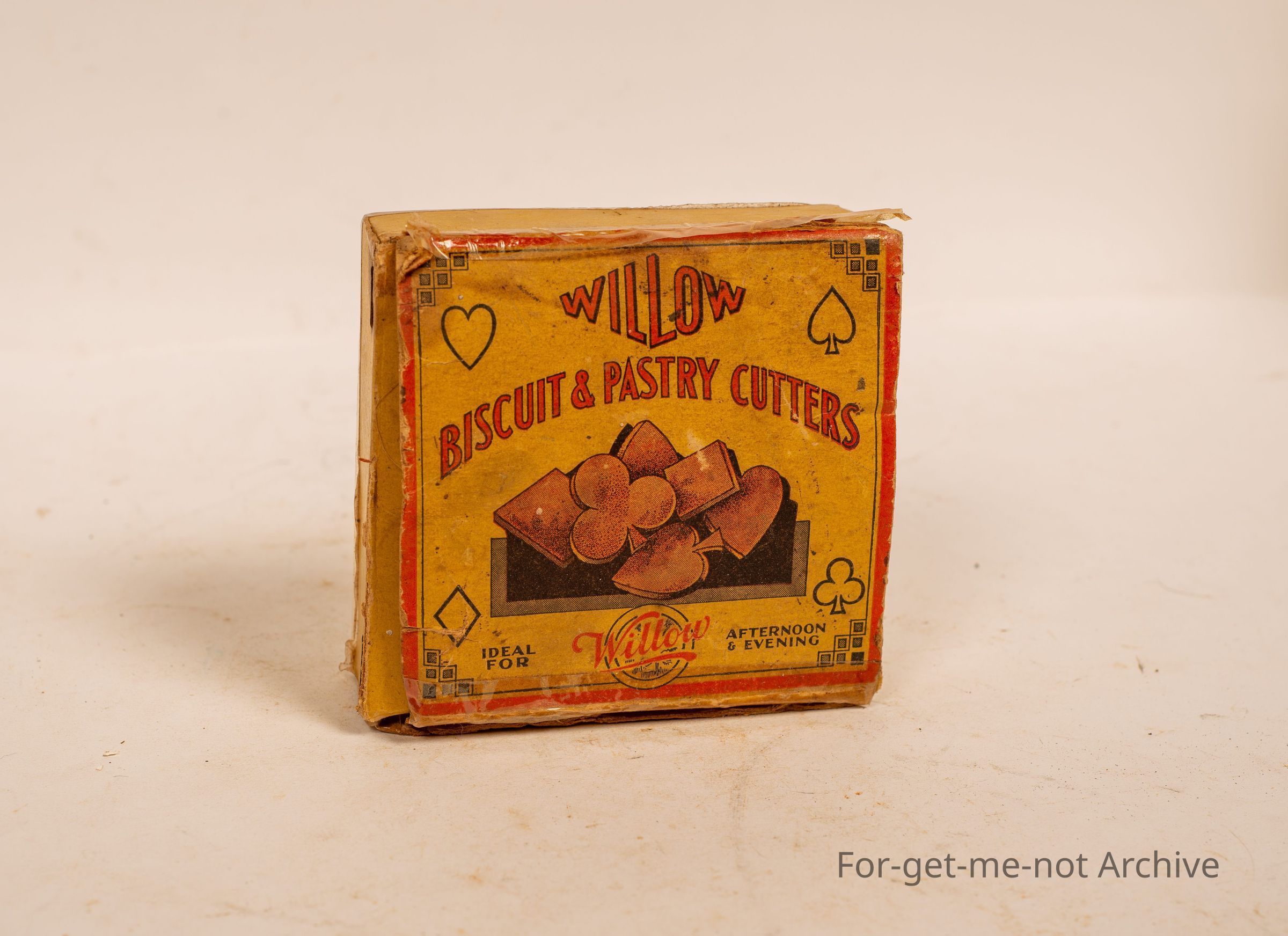 Is a cardboard box of Willow Biscuit and Pastry Cutters with contents. Box is a bit worn.