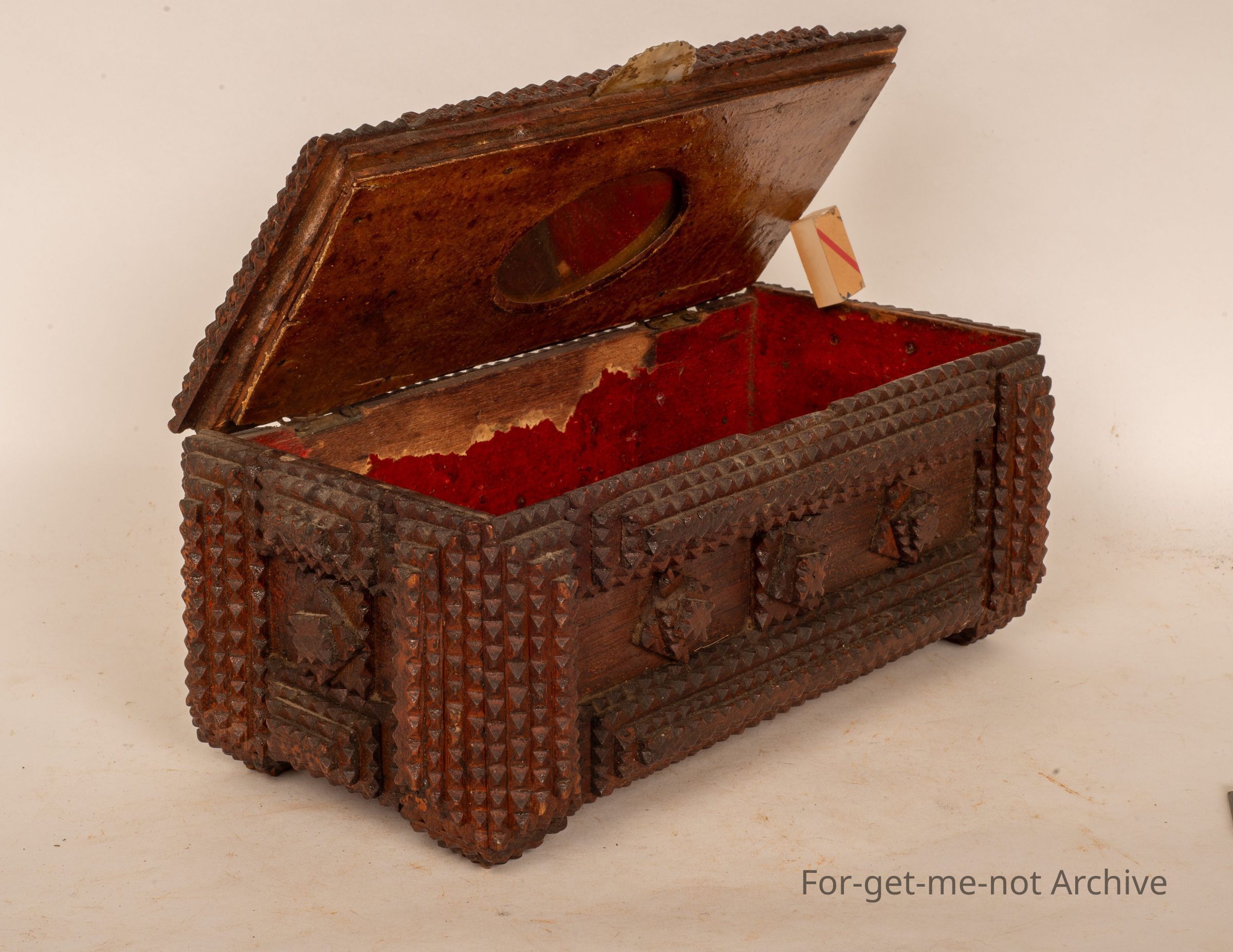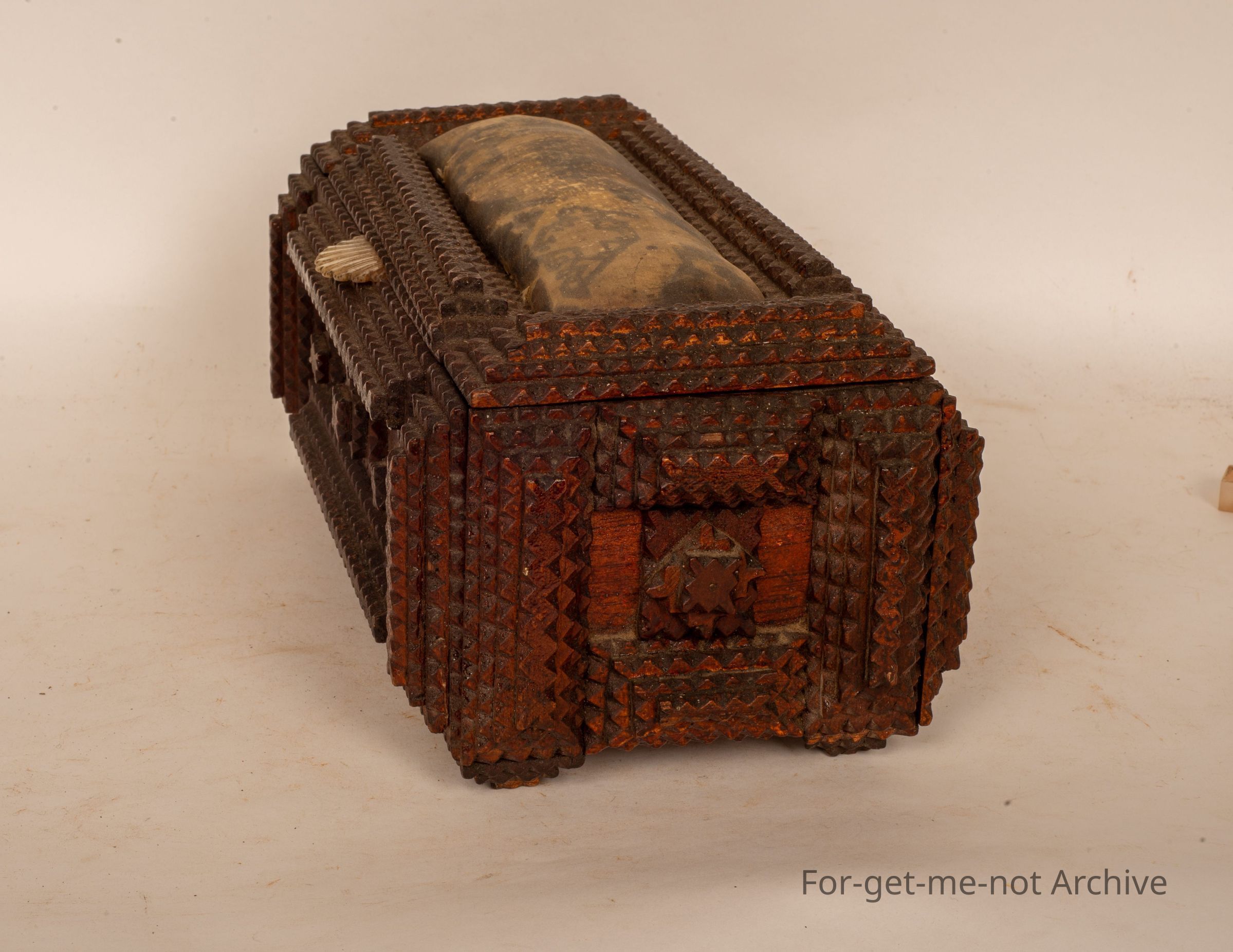 This is like a little sewing box. It's got a pincushion thing on the top, a shell that's been incorporated in for the opening, and a little mirror inside the lid. Very attractive, wonderful little piece.Collection
