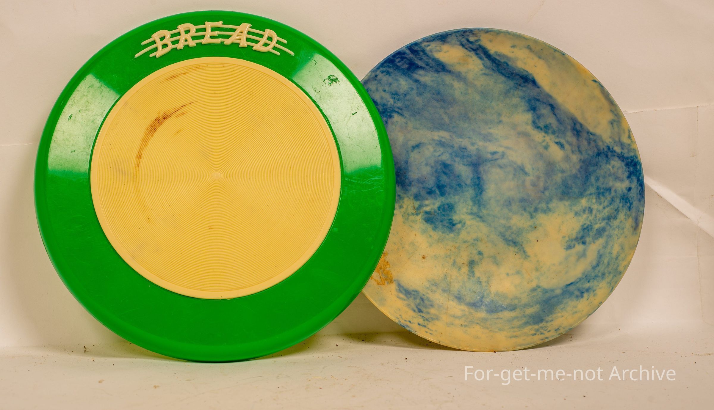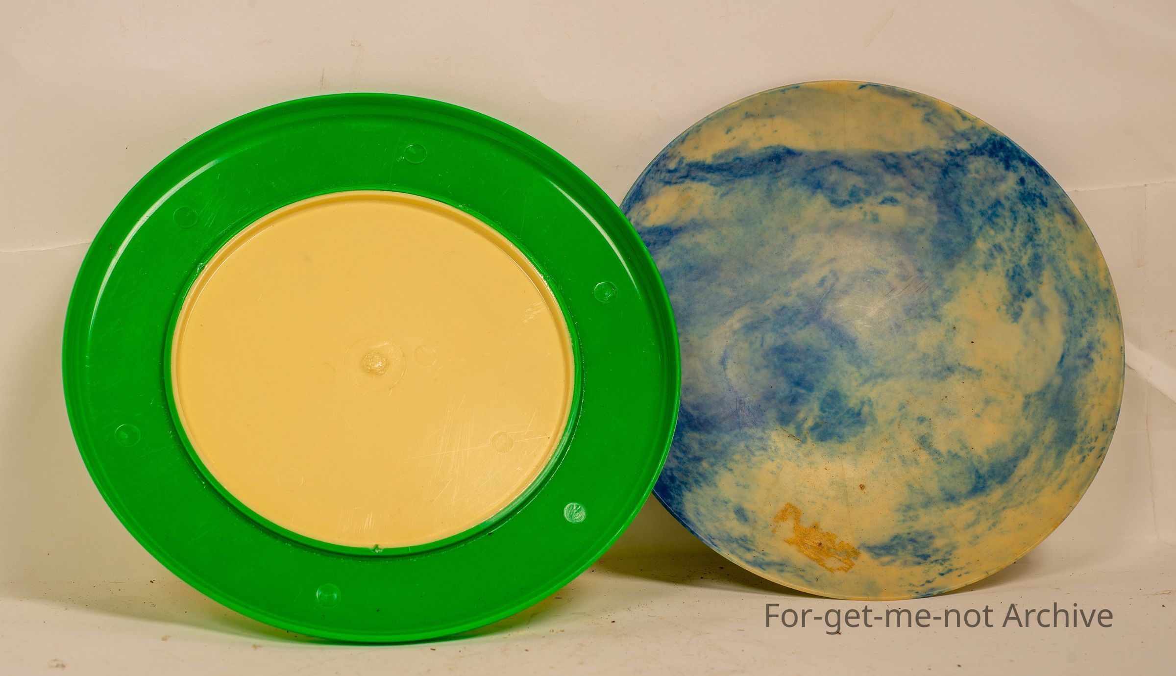 1 blue cloutish, 1 outer perimeter green with a yellow centre. One made of Bakelite marquin and the other a bread board ($15 each)