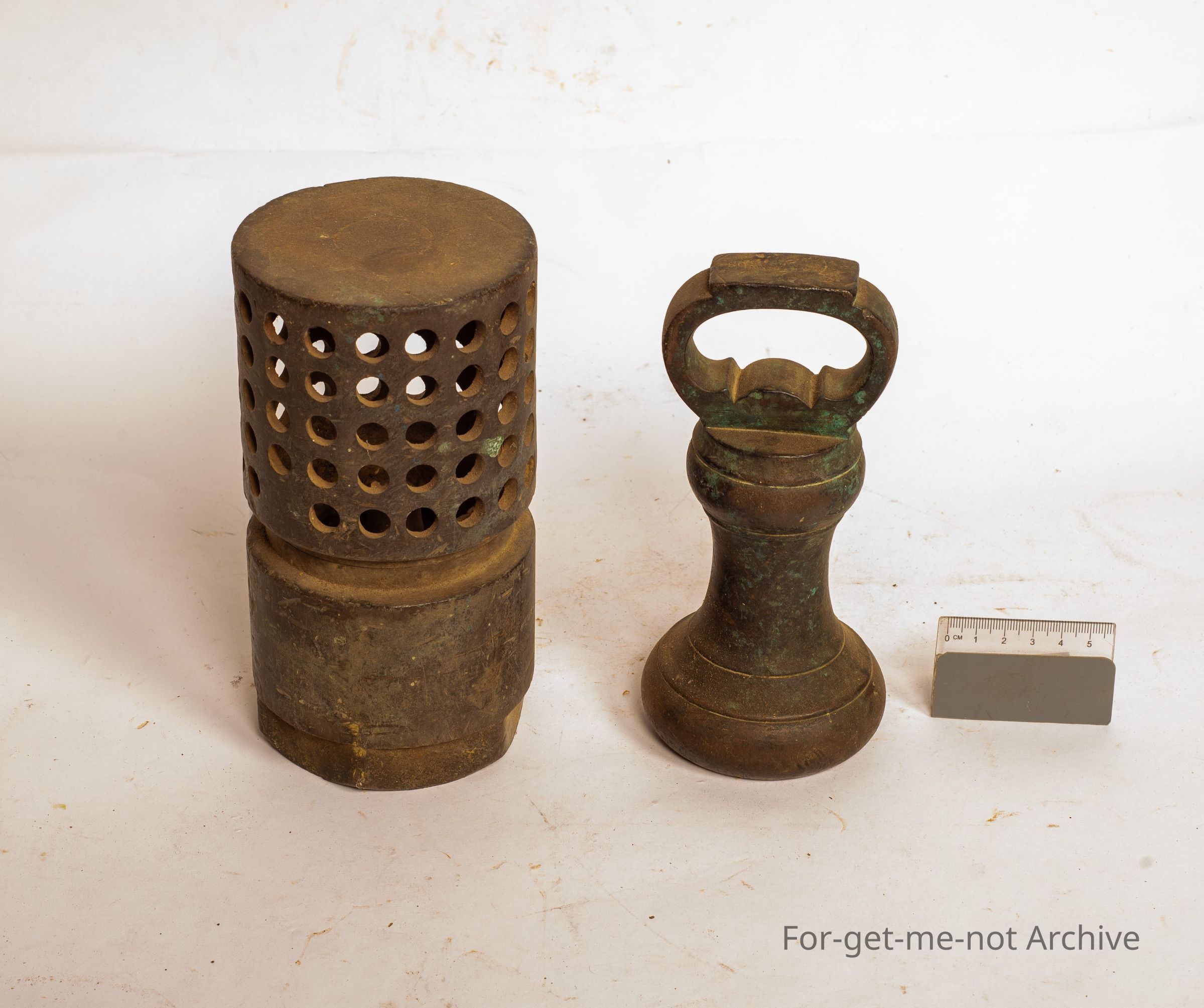 2 brass objects. 1, a shop scale weight. The other one, a, pumping clacker valve with a sieve,