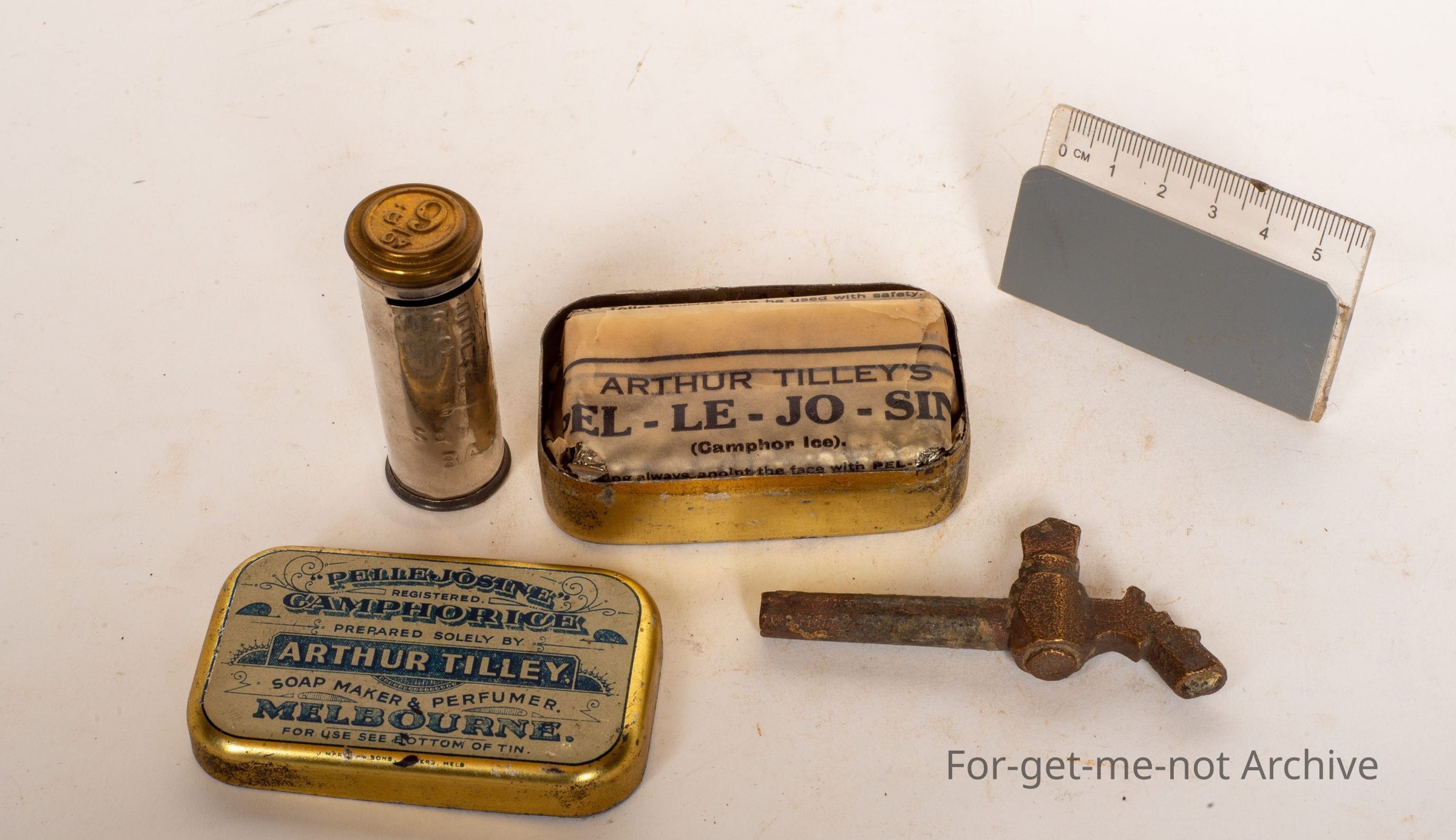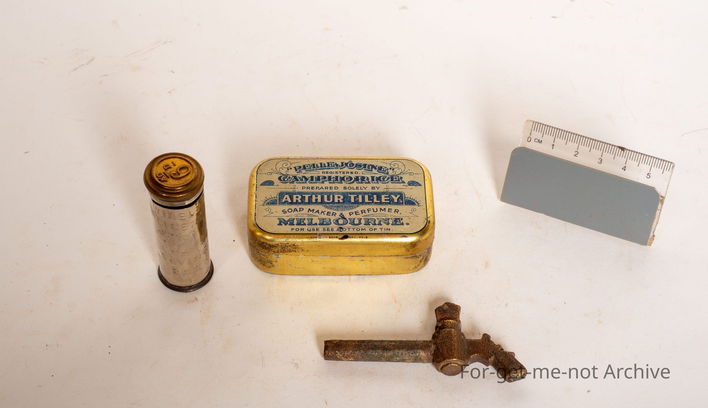 1. tin from Tilly soaps with camp rice soap inside, never been used, still wrapped in its packaging. 2. item was a very small brass tap of an early design, 3. item was a coin canister, probably holds about 25 Sixpences. The coin canister has written on it, the wireless license savings bank, back when you had to pay to get your license to have a listen to the wireless? It's got a pound sign on it too.Collection