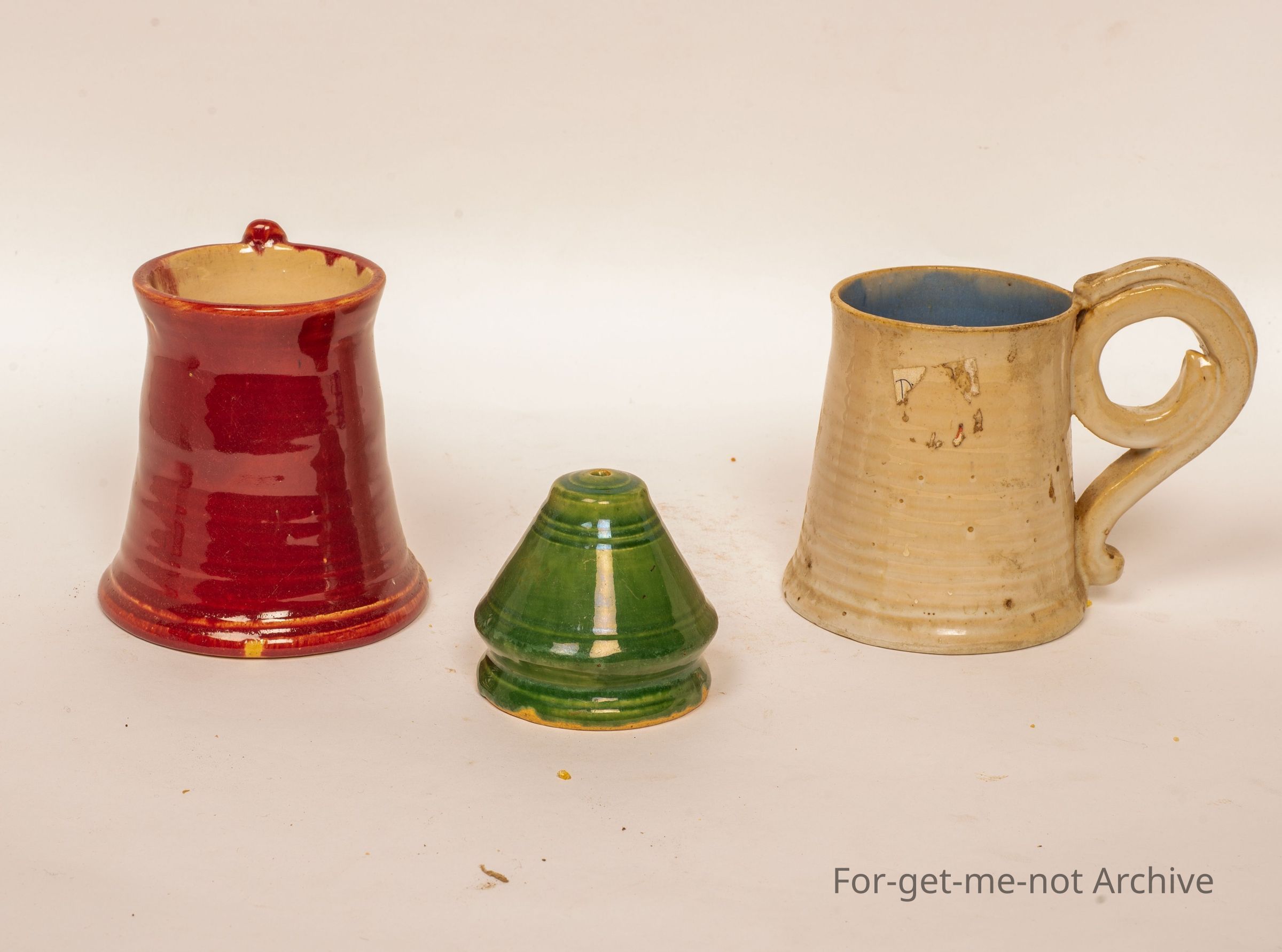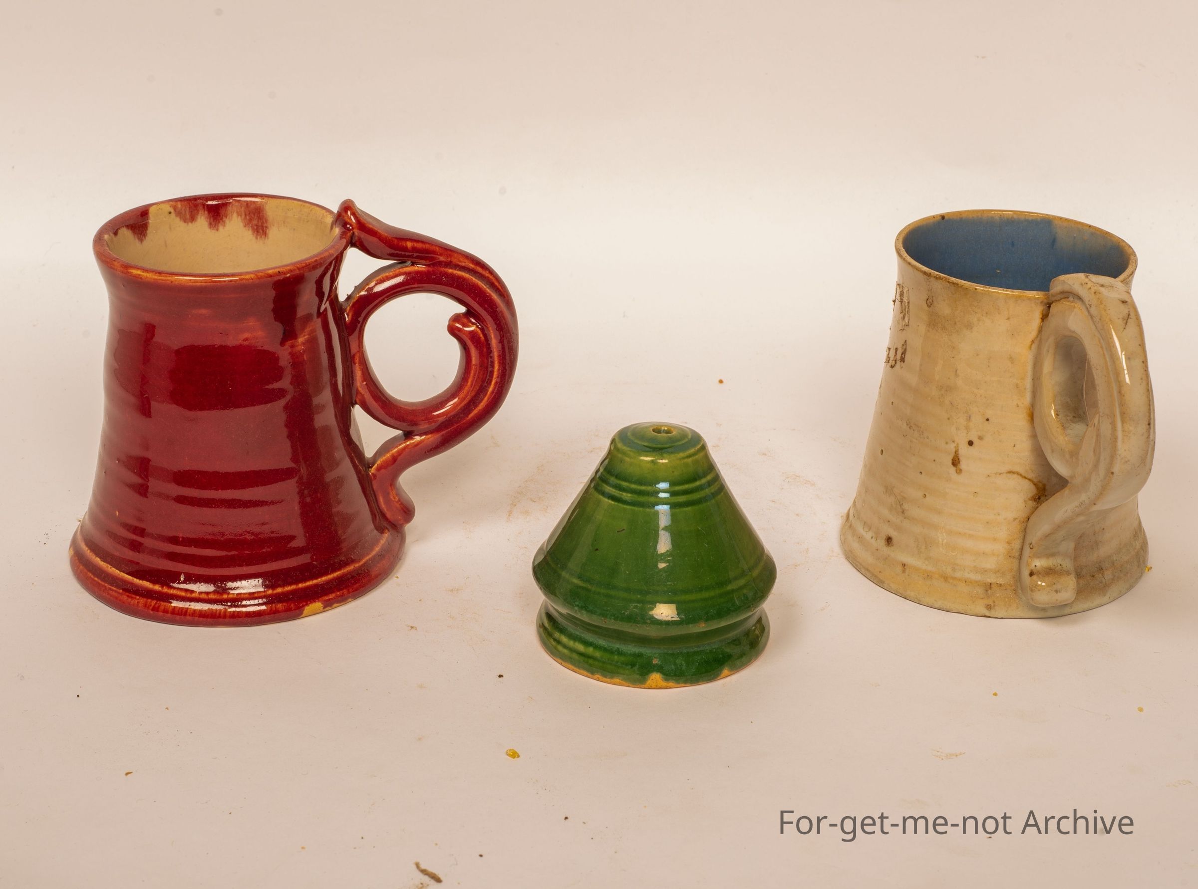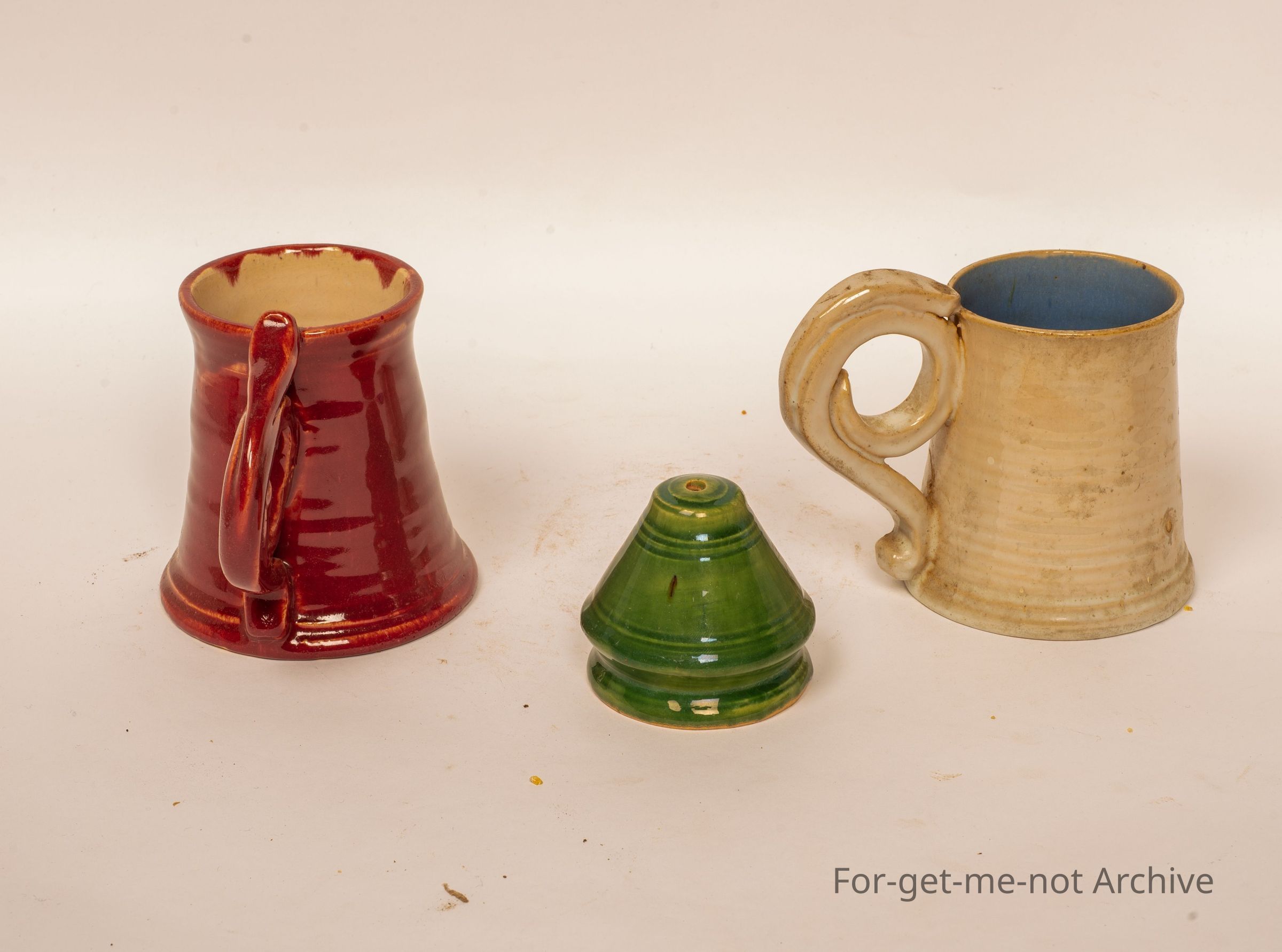 This is three pieces from Dyson Studio, 2 cups with the wonderful classical handles, and a small salt shaker, all signed, all in good condition.