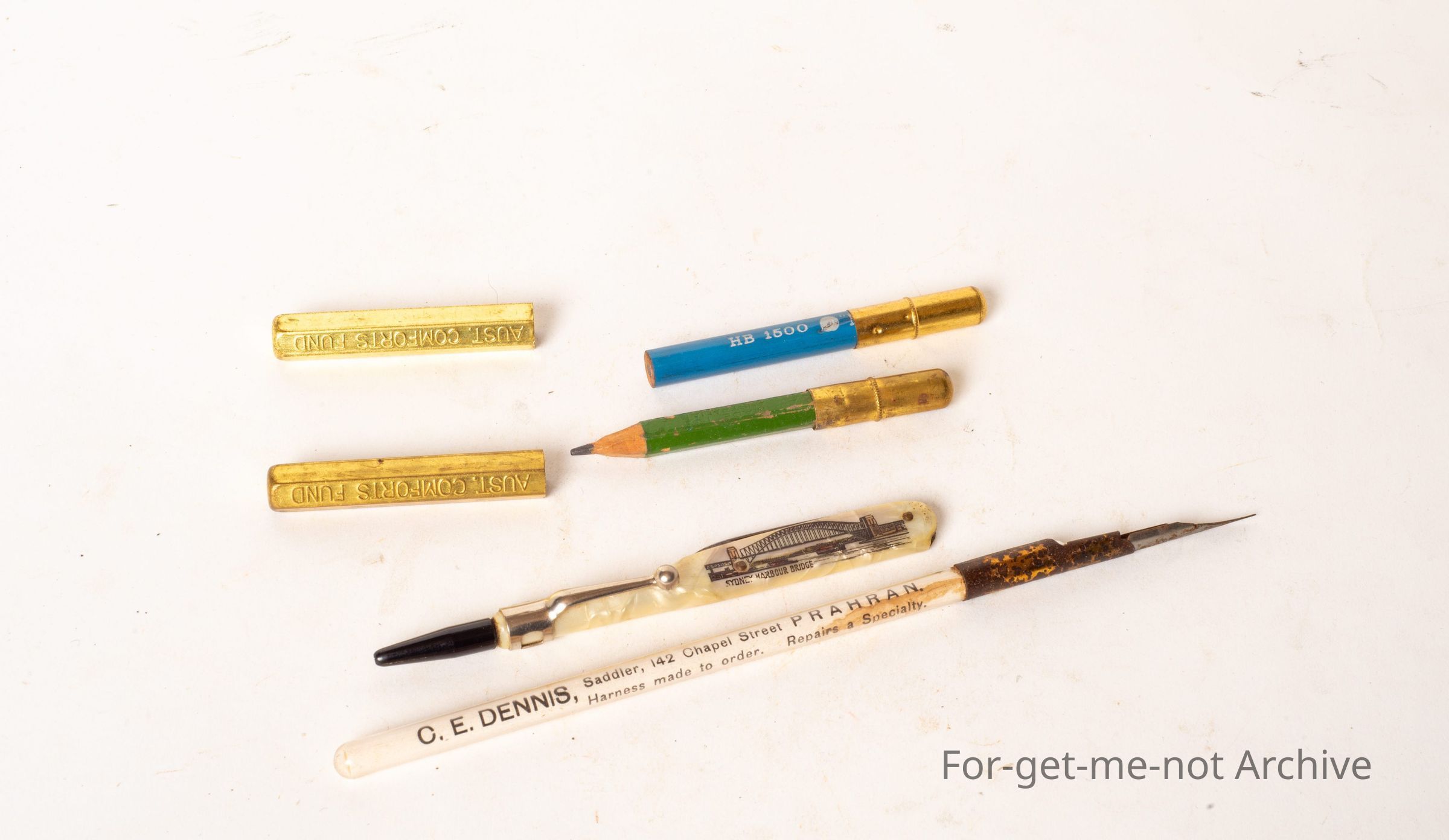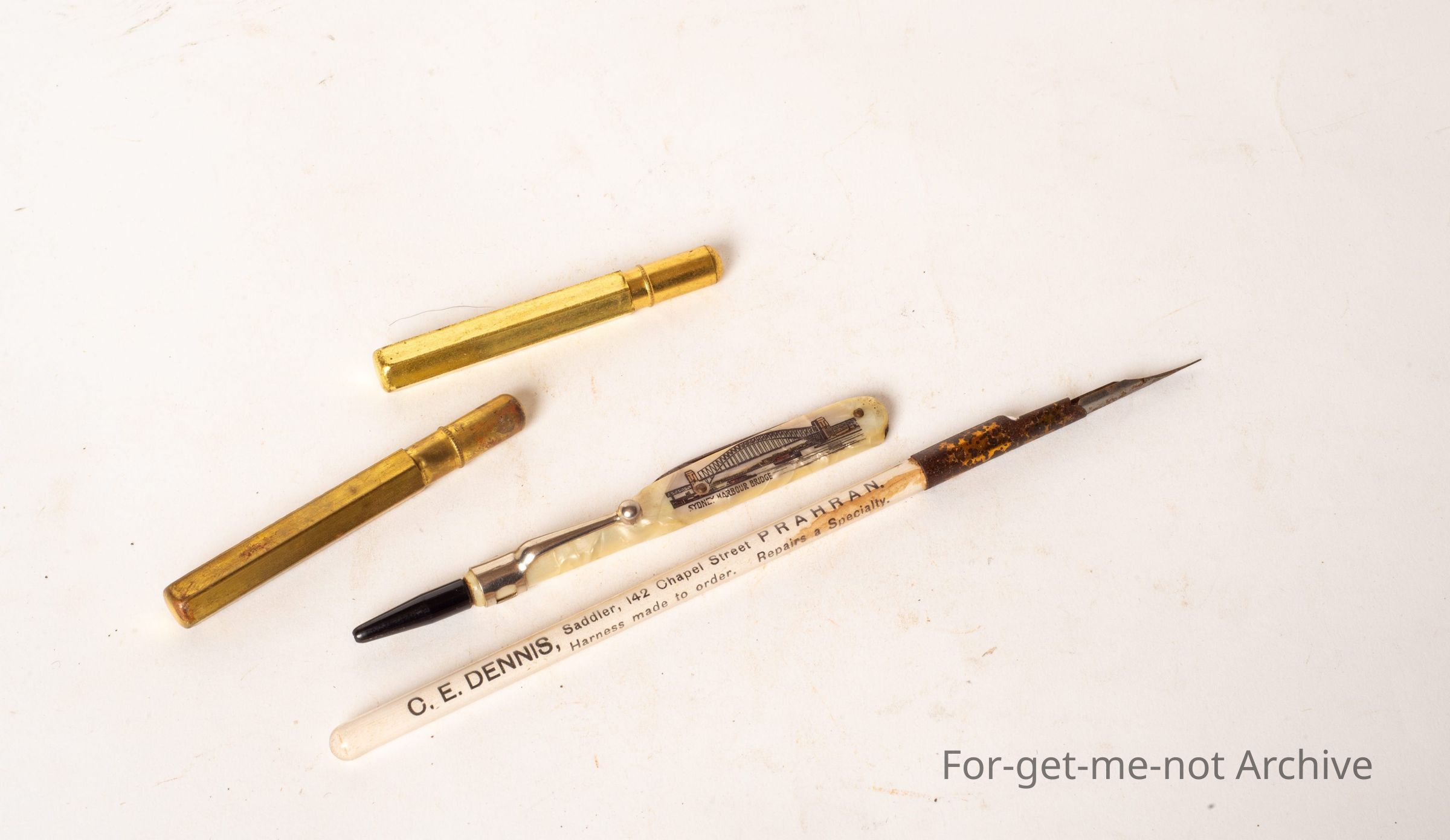 The first one is a mother of pearl handle, advertising the Sydney Harbour Bridge with a little clip to hold it in your pocket, 2 x metallic pencils inside them you just pull the tops open and the pencils come out. 3rd one, the 4th one is a pen with a nib and it's got on the handle C E Dennis Saddler PrahranCollection