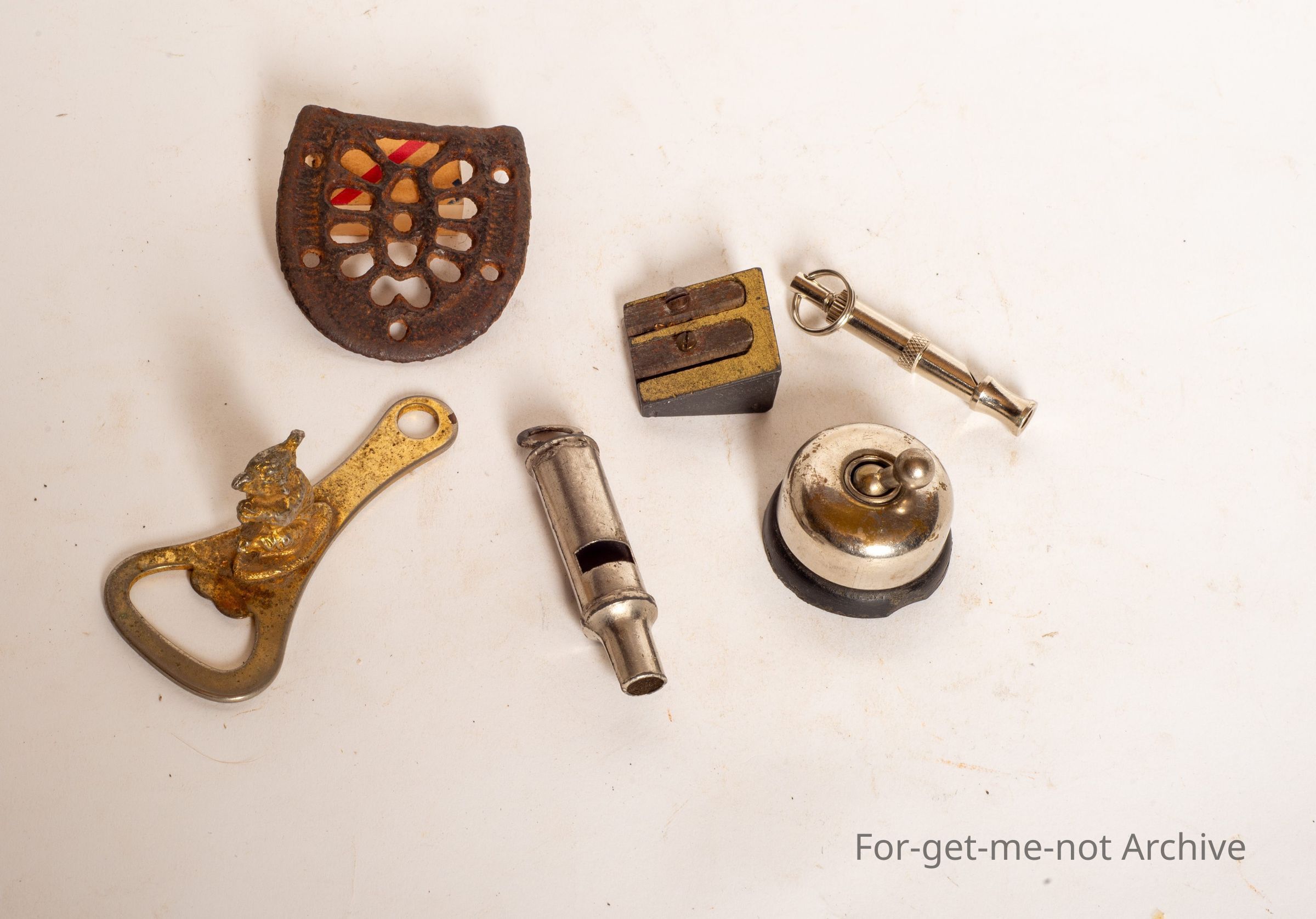 1. an electric switch round stainless steel 2. boot hill boot heel 3. bottle opener with a koala on it, 4. dog whistle, 5. pencil sharpener, 6. whistle of some sort,