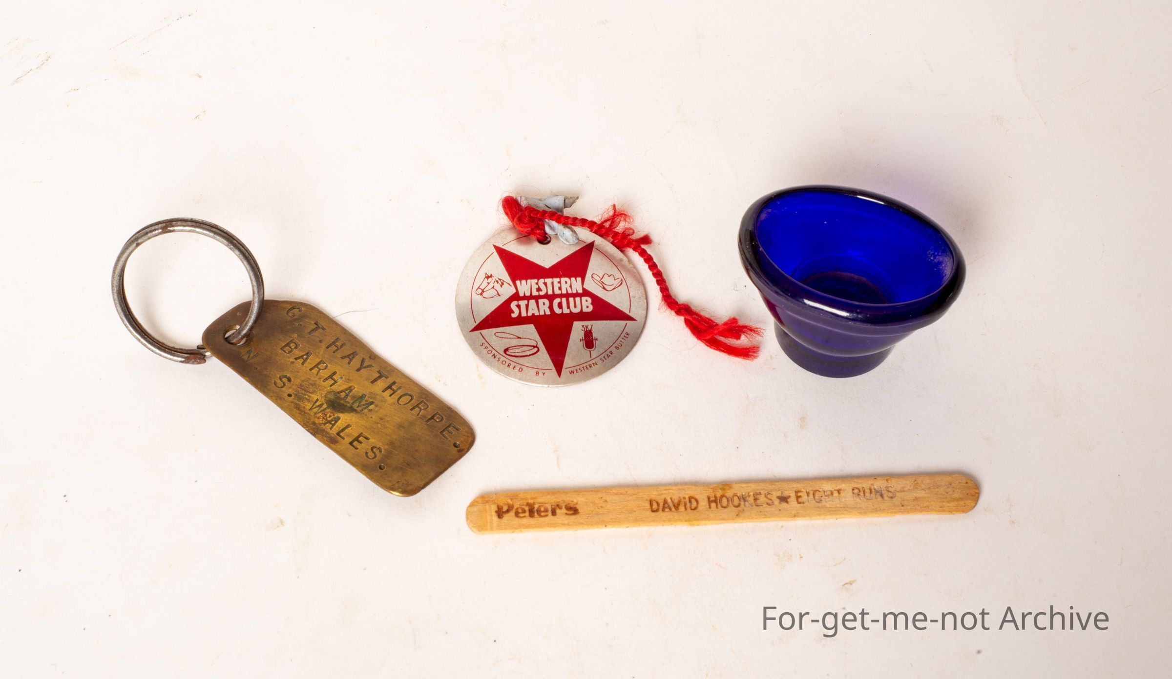 1st item is an eye wash, glass eye wash. 2nd item is a, sponsorship, some sort of advertising called the western star club, third one is a metal tag with G T Haythorpe Barham in New South Wales and the last one is an ice cream stick, Peter's ice cream stick with David Hooks, 8 runs on it.Collection
