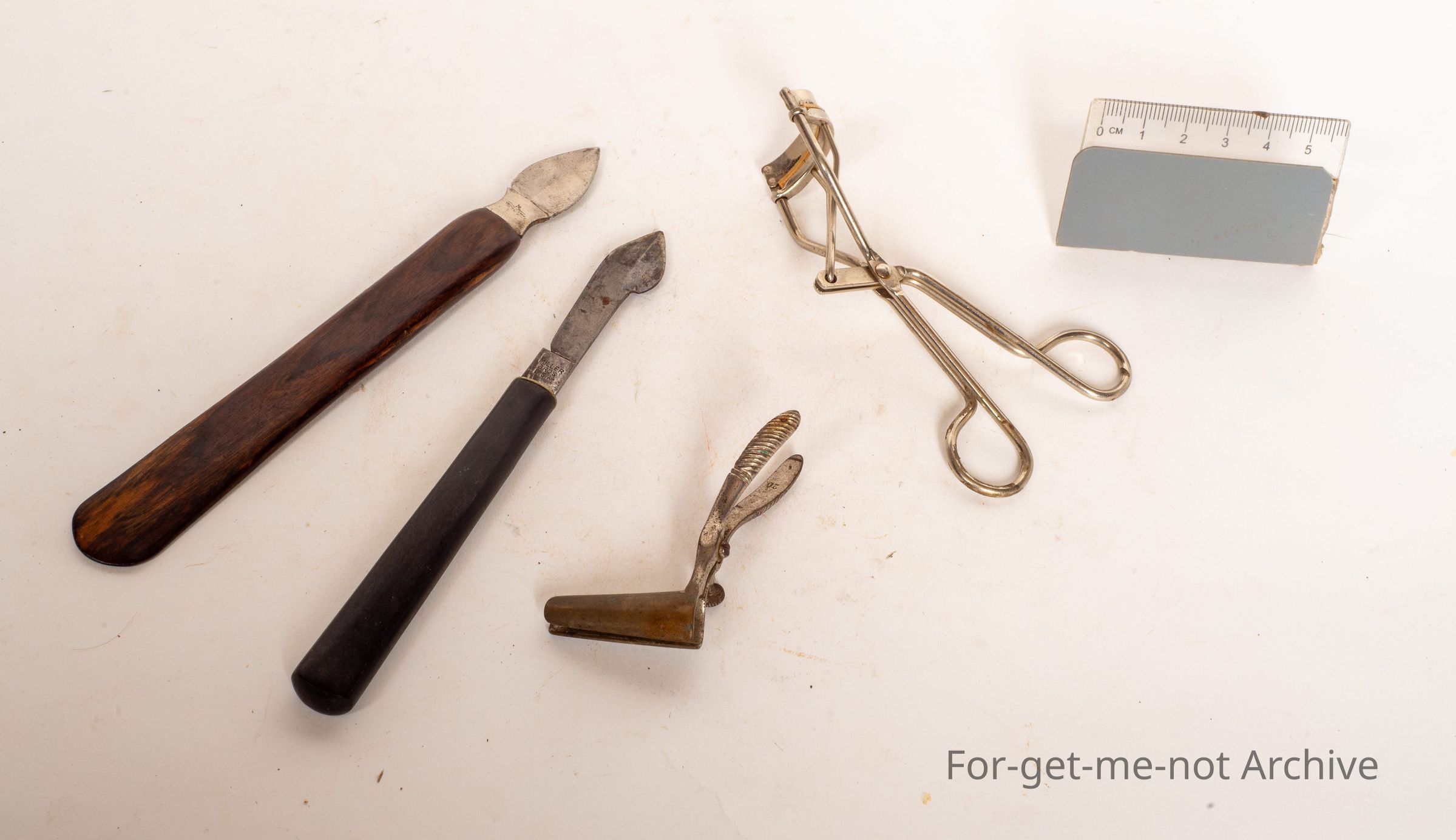 1. 2 of the items are wooden handled scalpels, early medical. 2. We have another pea remover 3. for trimming eyelashes.