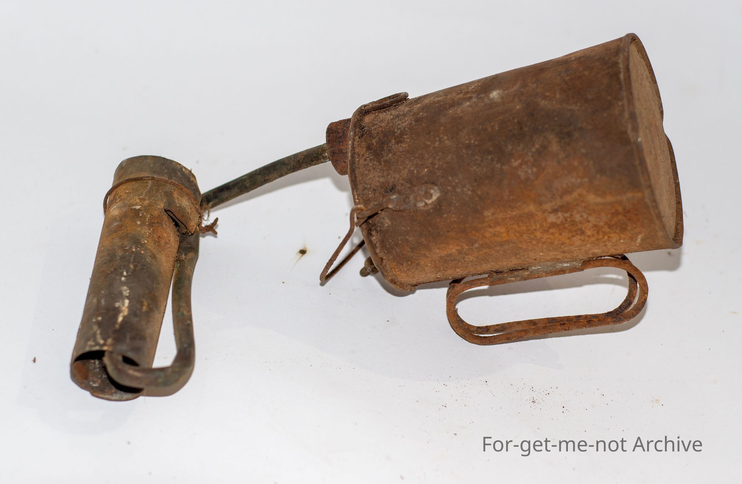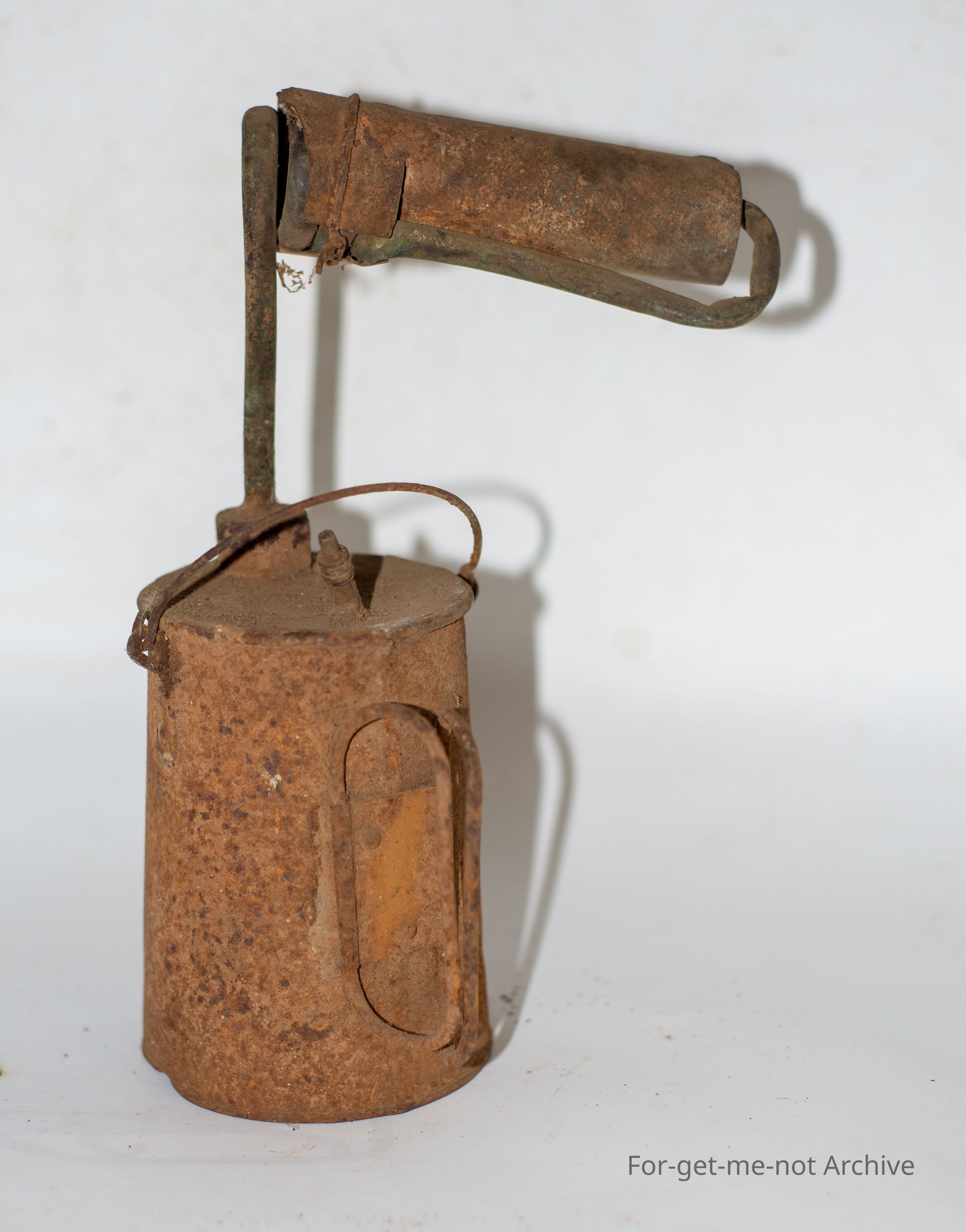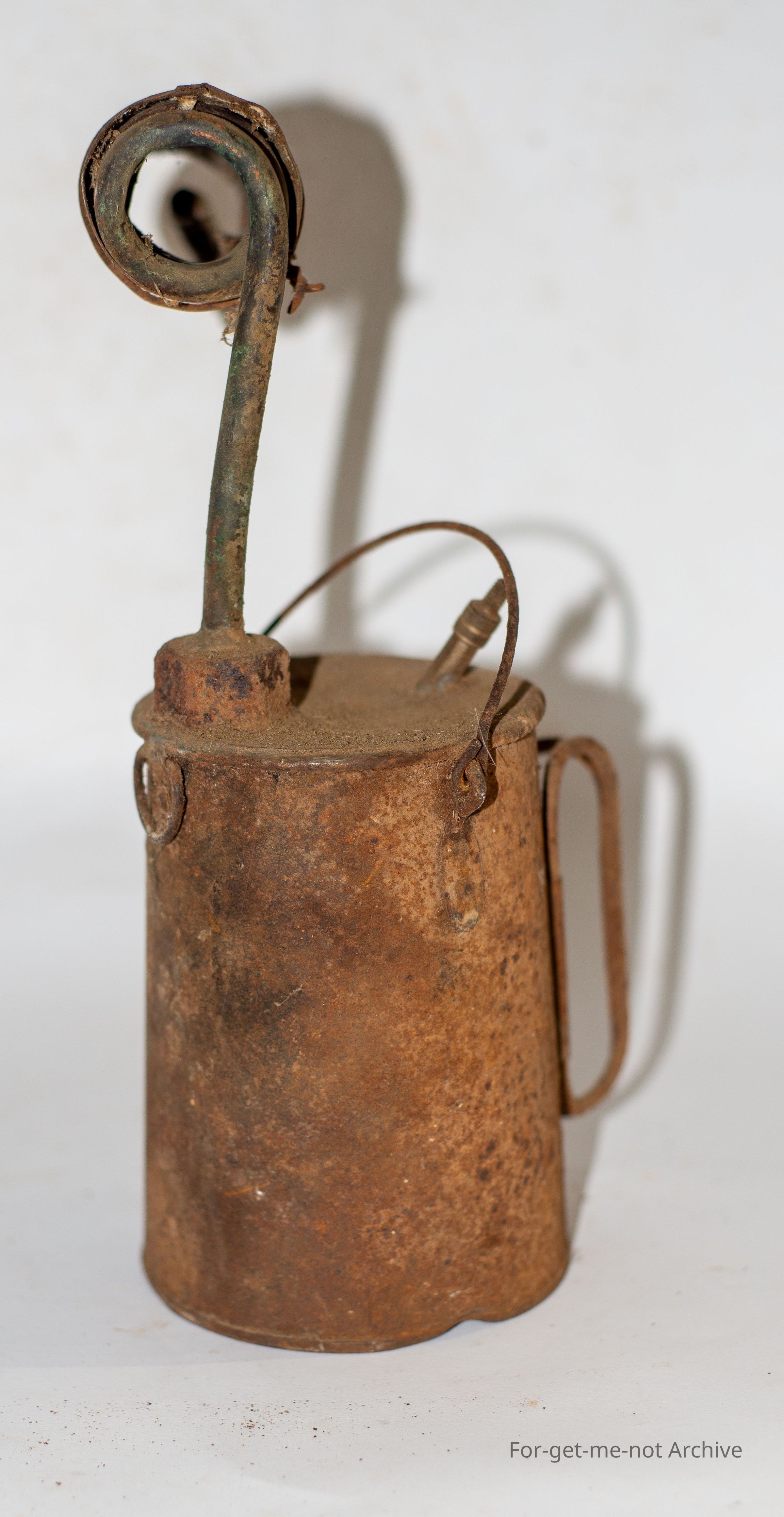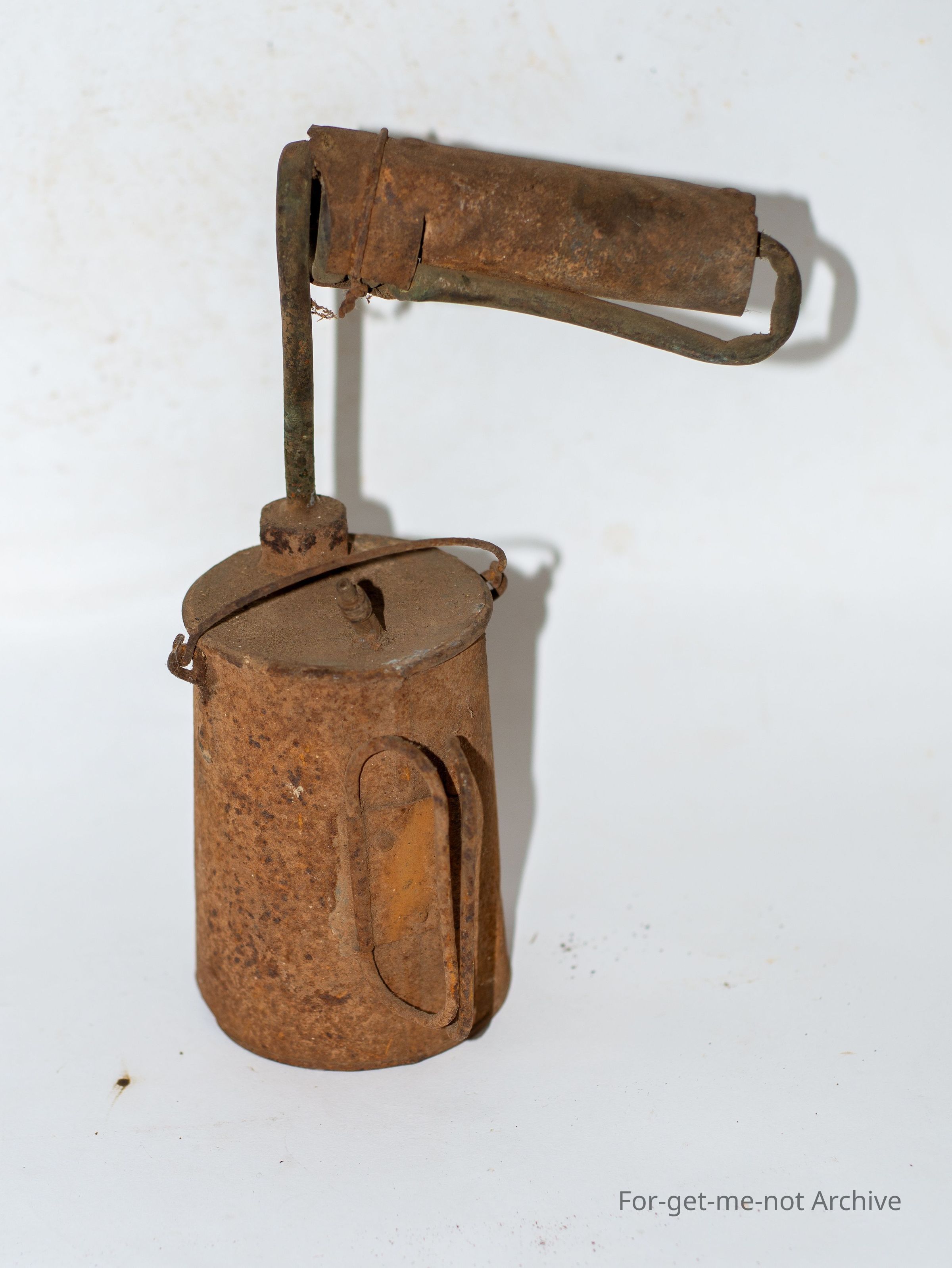 This blow torch was fashioned from a WW1 Quart pot billy which has been sealed and had a car tyre valve inserted into can to provide pressure for the lamp, crudely fashioned but probably worked when requiredCollection
