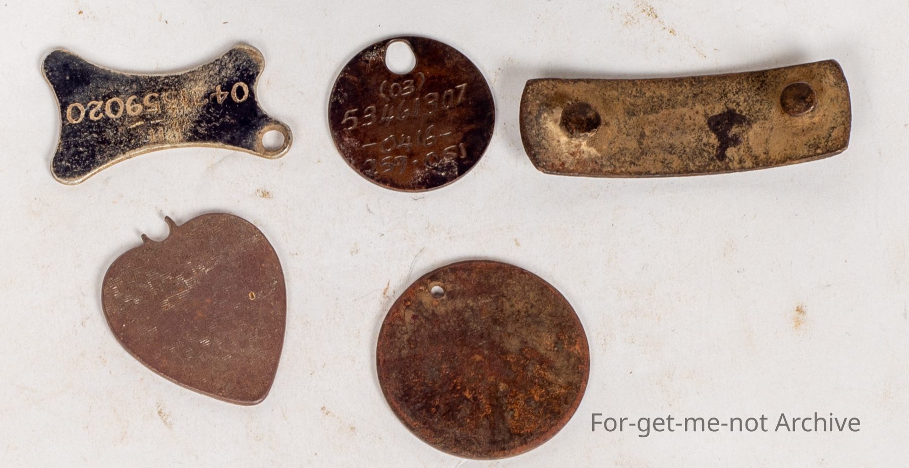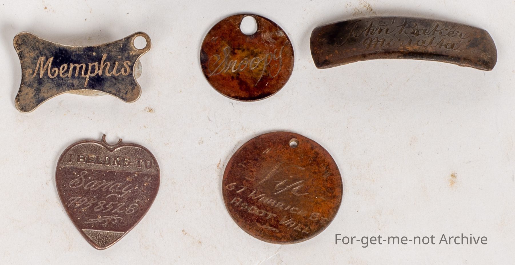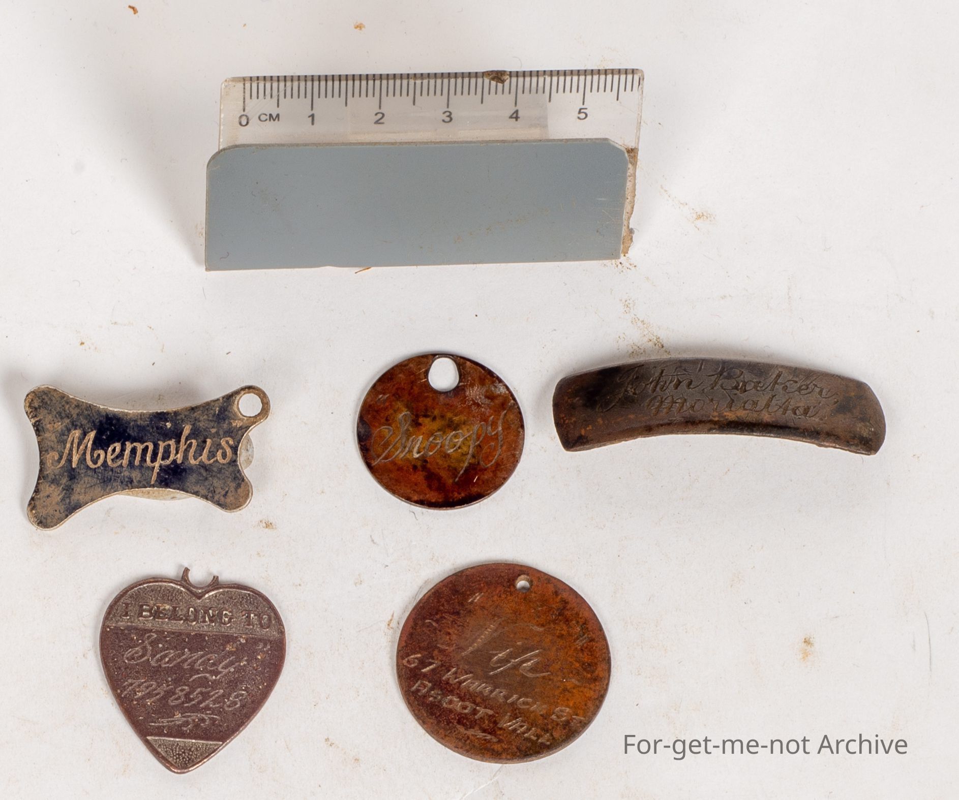 The first one is, NIP, return to NIP, Ascot Vale. The second one is Sandy with a phone number. The third one is, Snoopy, once again, a phone number. Then there's another one with Memphis and a phone number. The third one is John Barker from Morialta, South Australia. This is a plaque off the collar of his dog. John Barker was a well known identity in South Australia. Morialta is now a public park area north of Adelaide.Collection