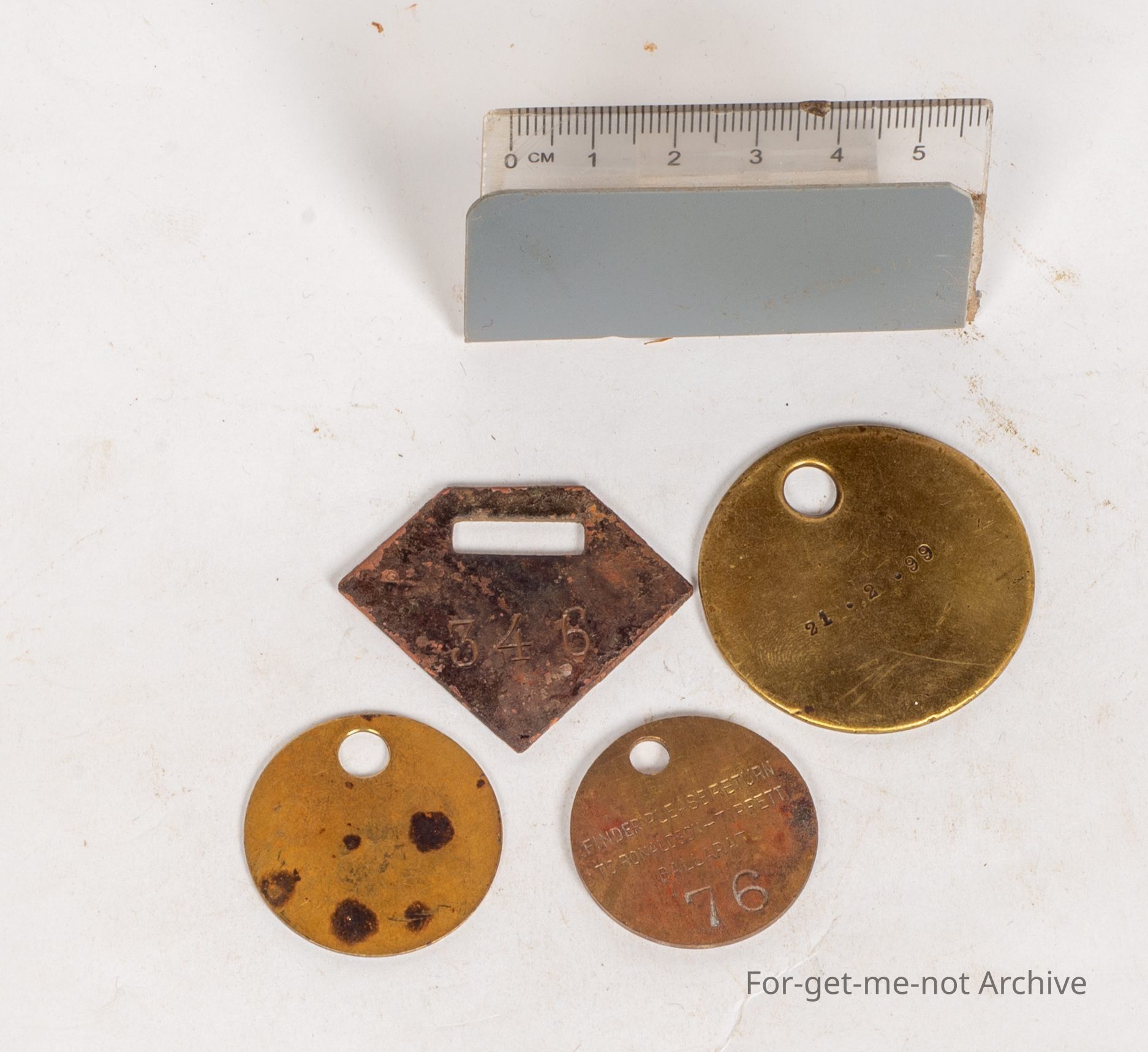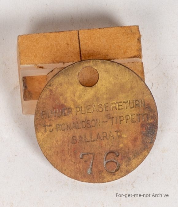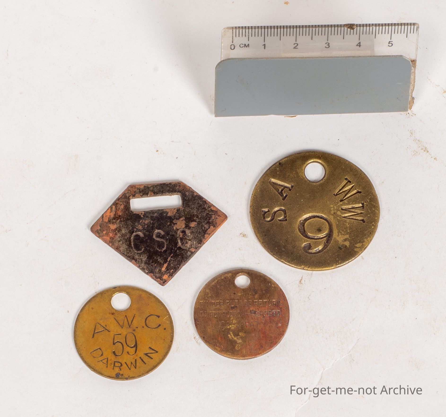 This has probably been a key ring holder punched in is please return to Ronaldson Tippett Ballarat. The next one is South Australian Railways, stamped number 9 . These were workers pieces. Another one is from AWC Darwin 59, not certain of that one. 3rd one is possibly a common tag rego stamped c s c, which is Colac Shire Common. Doesn't state what animal.Collection