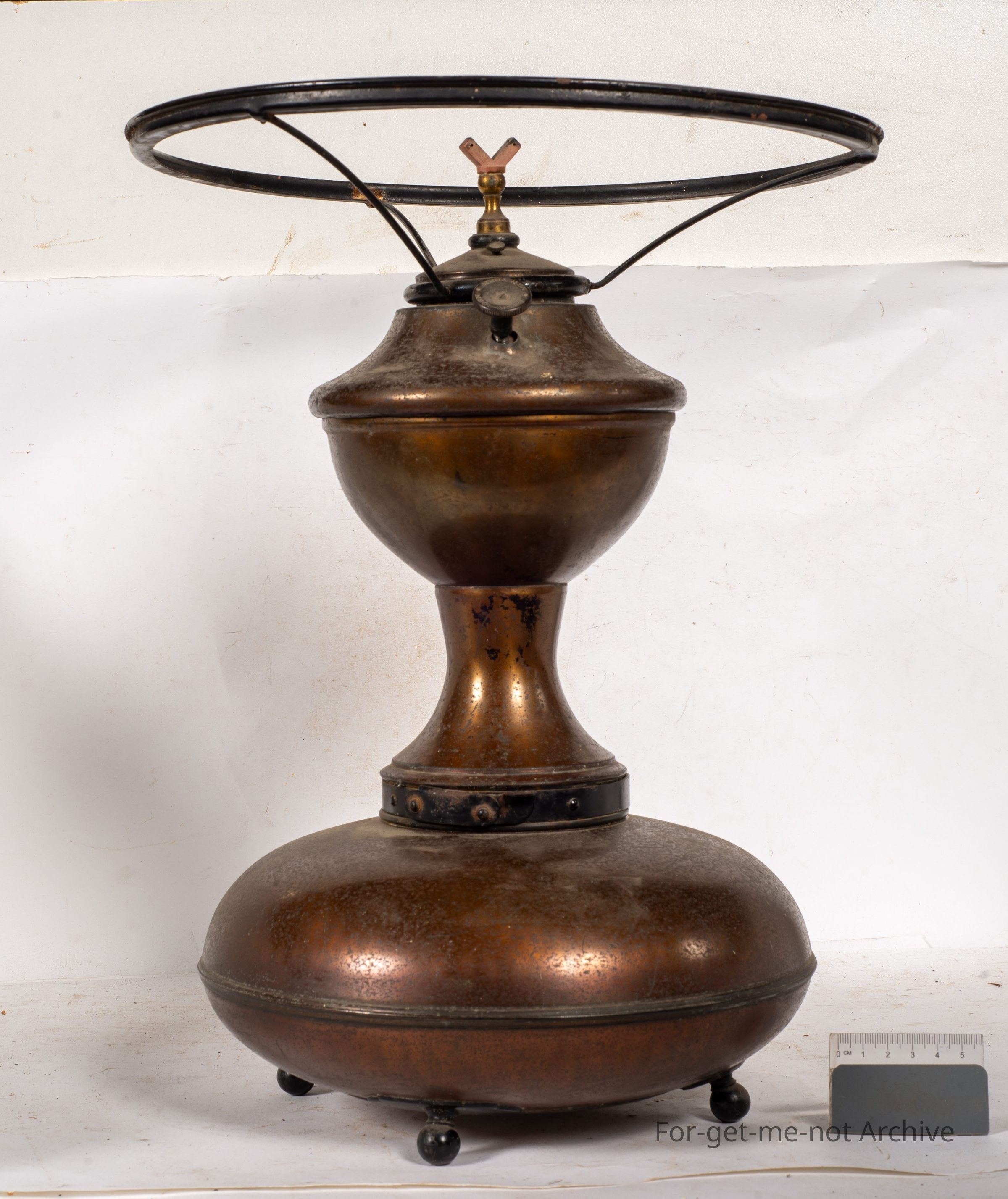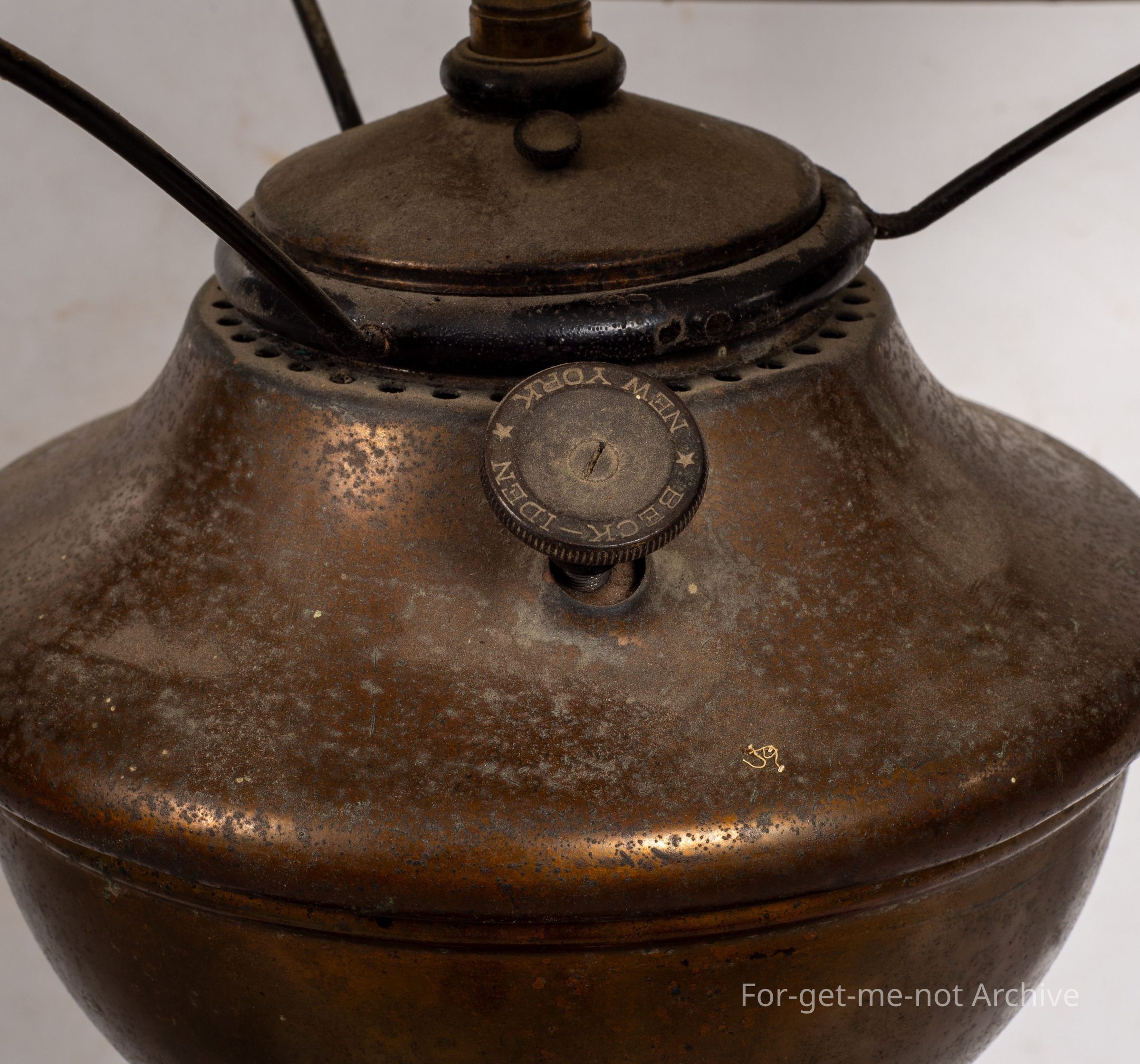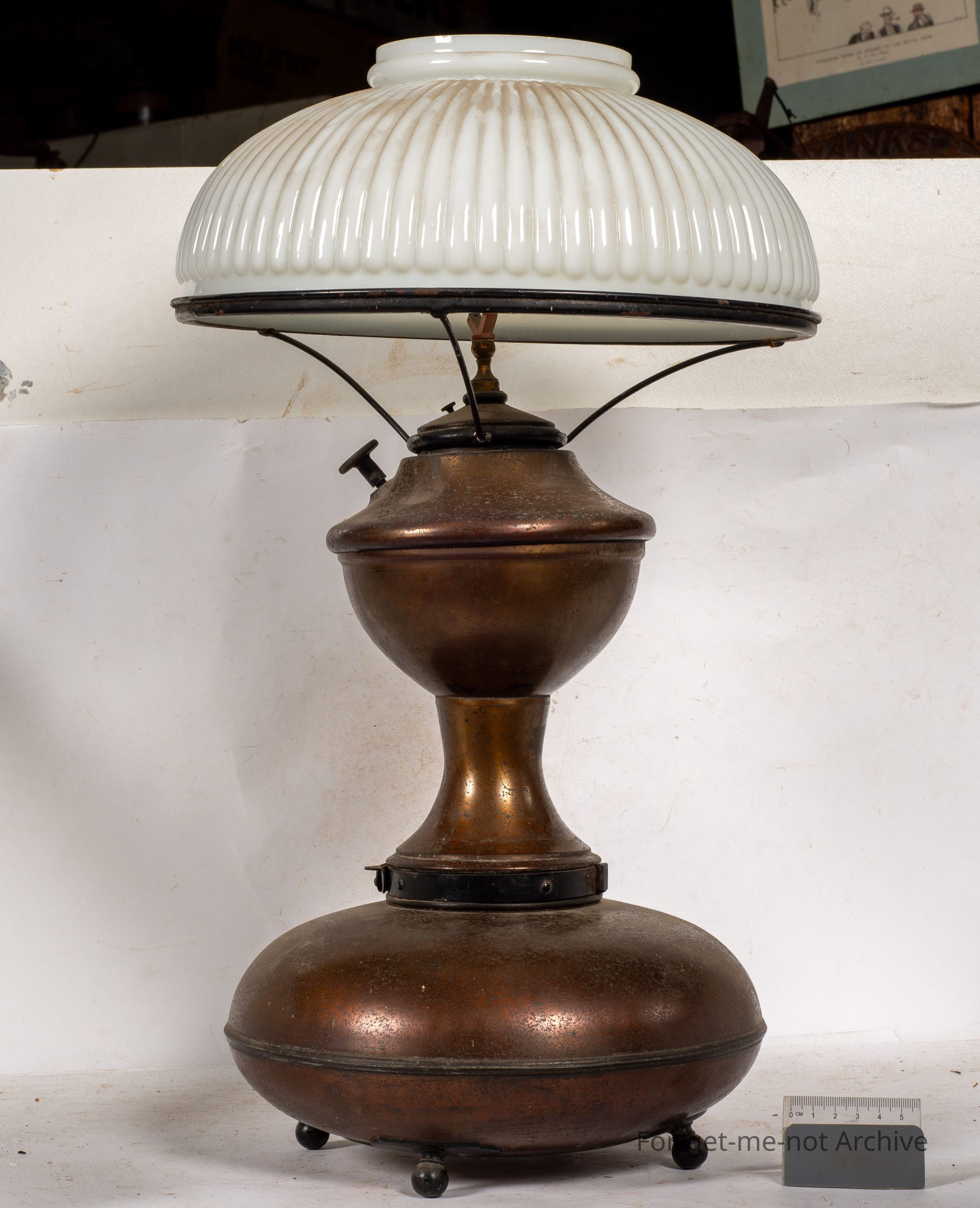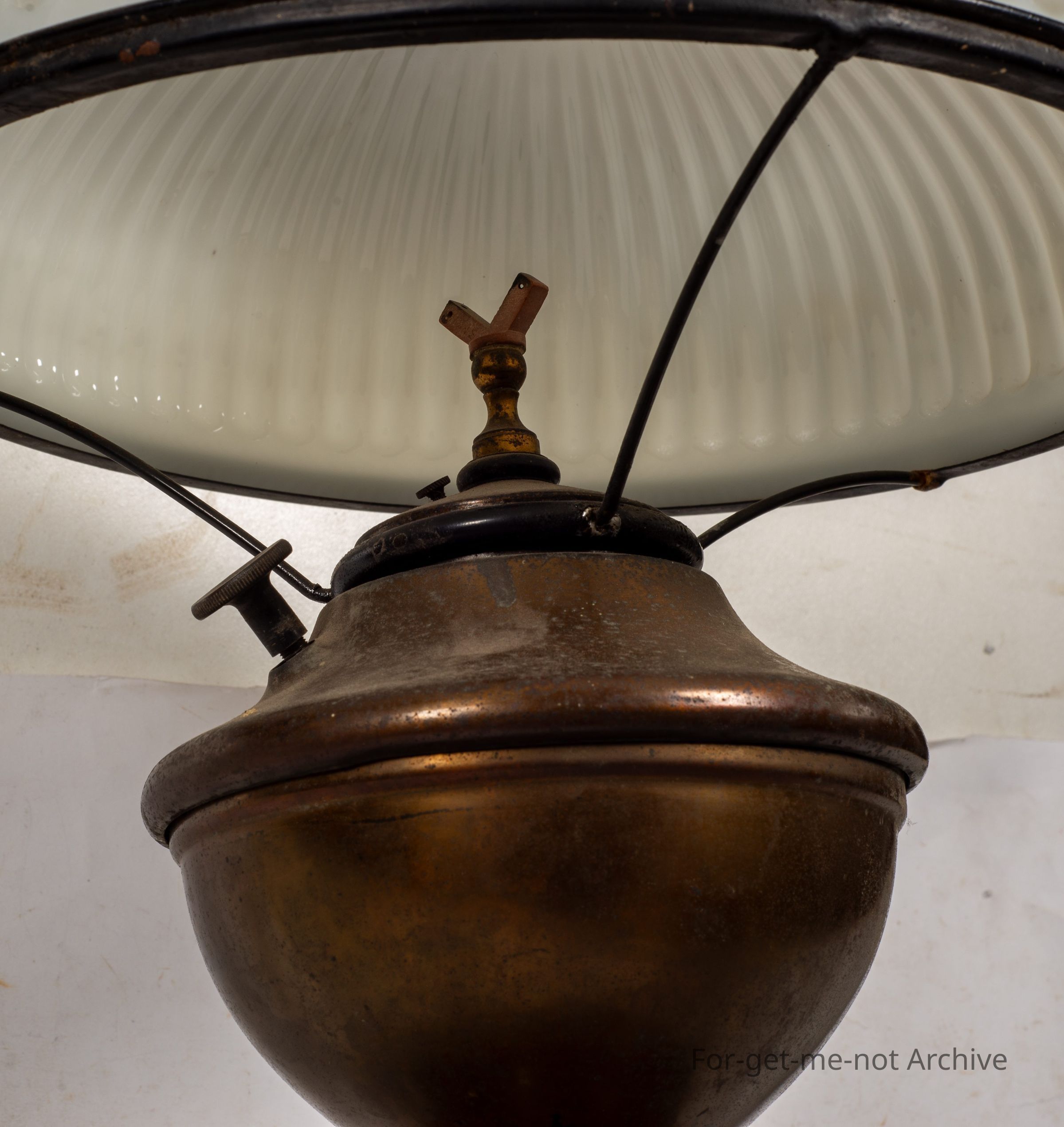 Sangeet Collection. This lamps is called the Beck-Iden. This lamp is unusual because it is a domestic acetylene lamp, which means it creates gas from carbide, which is called acetylene. Very few of these type of lamps about. Has a beautiful fluted, canopy, shade, in perfect condition. An absolute rarity in Australia. The name is Beck-Iden from New York.Collection