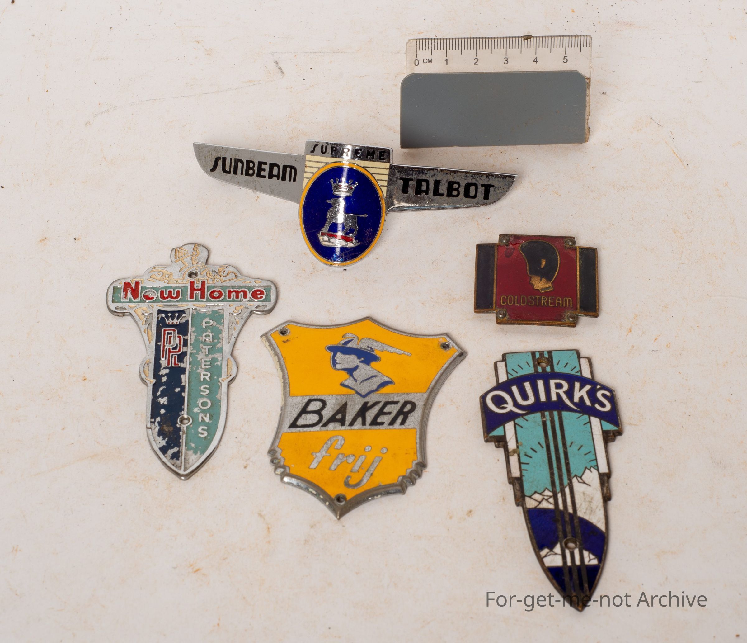 Another group of 1, 2, 3, 4, advertising badges. First one, Coldstream, all enamel, lovely little piece. Second one, Sunbeam Talbot Supreme. Number 3, new home. And then Barker fridge, Another enamel one.Collection
