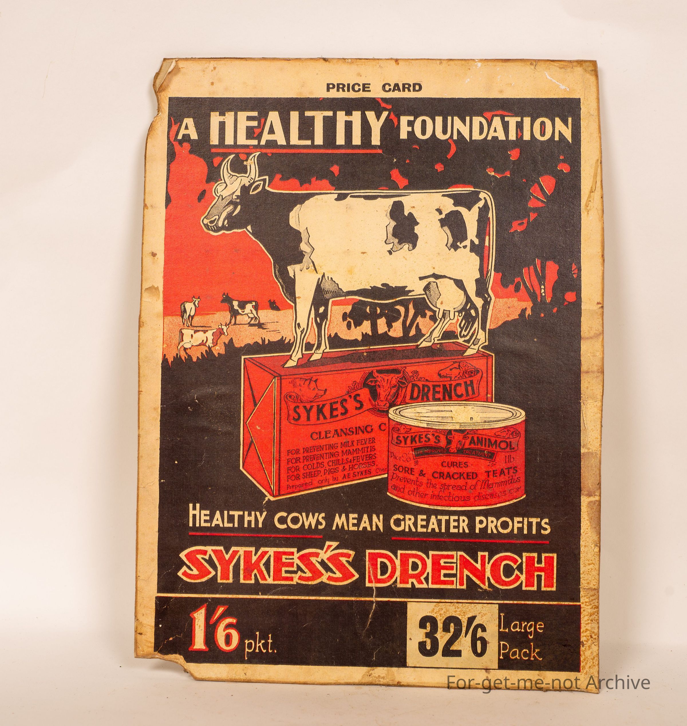 Cardboard advertising card for Sykes, Drench, Healthy Foundation, Victoria of Cow, standing on top of a Sykes box.