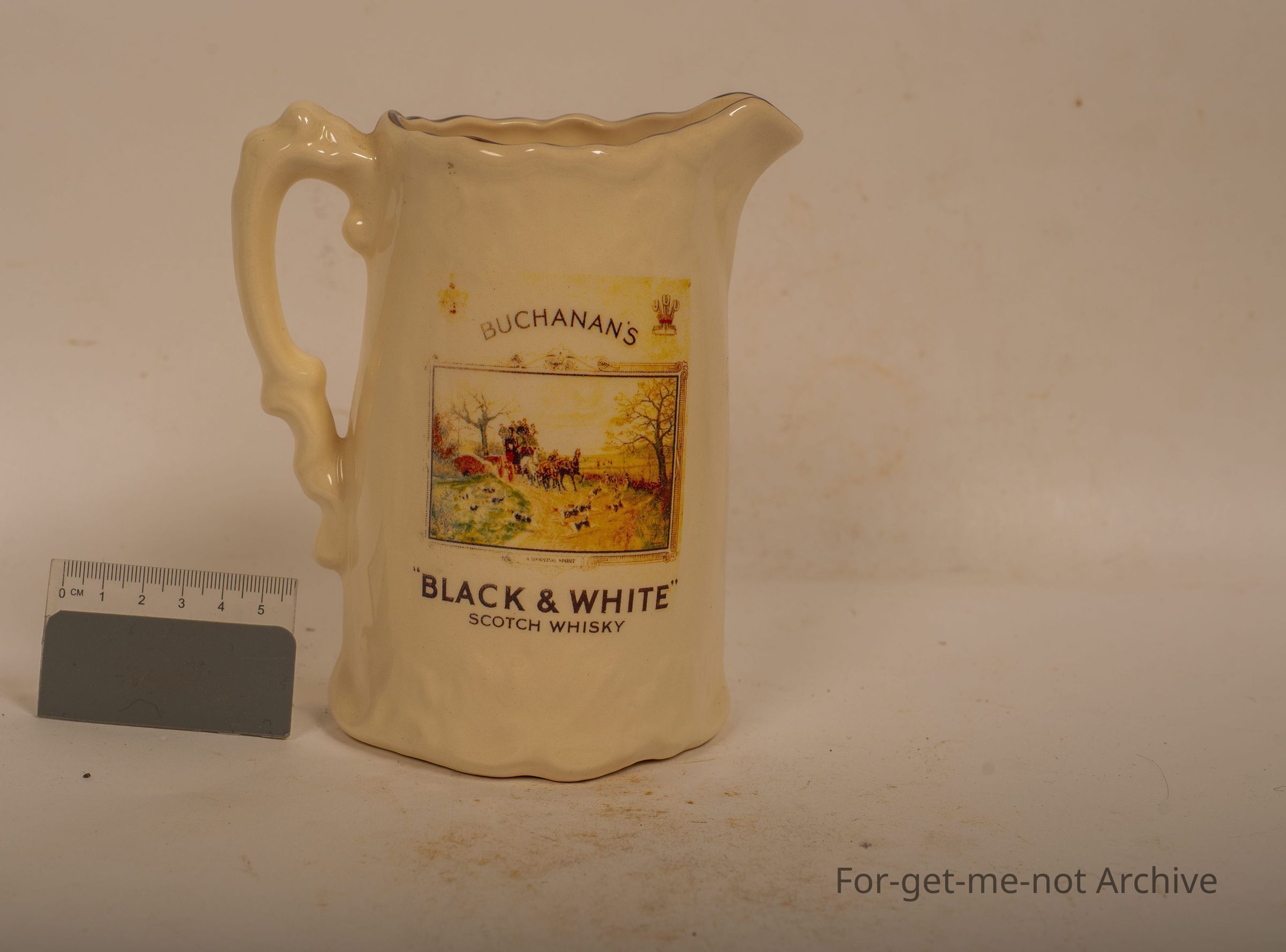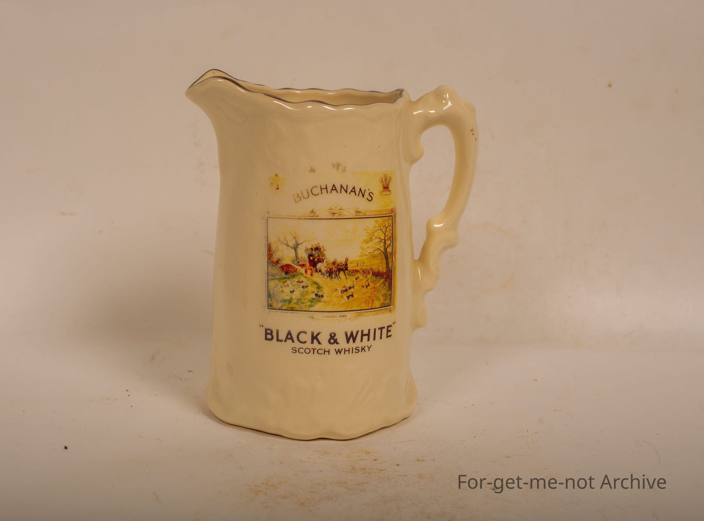A very old water jug, advertising Buchanan's black and white Scotch whiskey, diagram of a coach horse with hounds. On the front, this would be a very early piece. Haven't seen it before.Collection