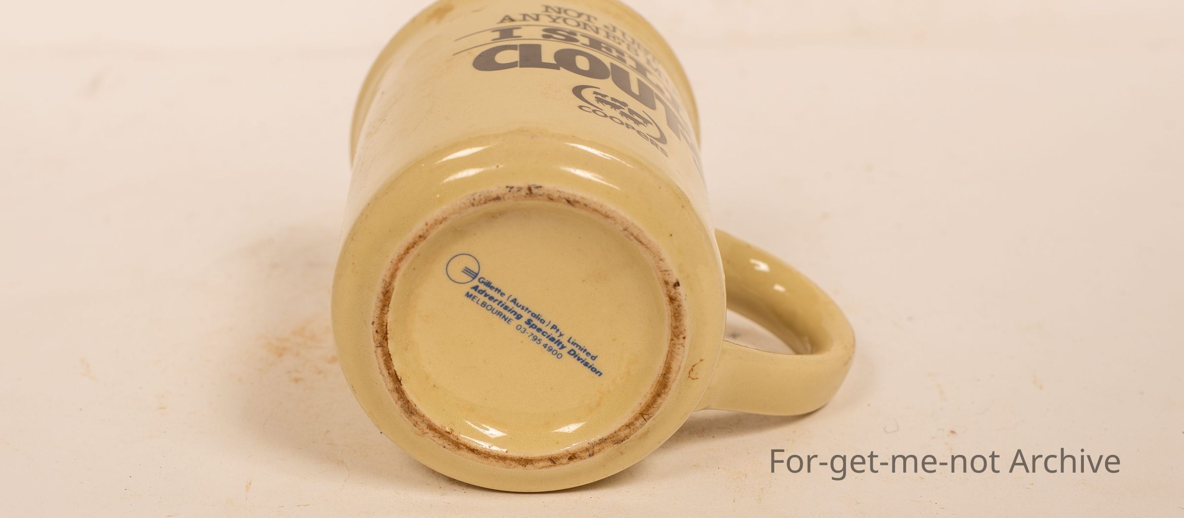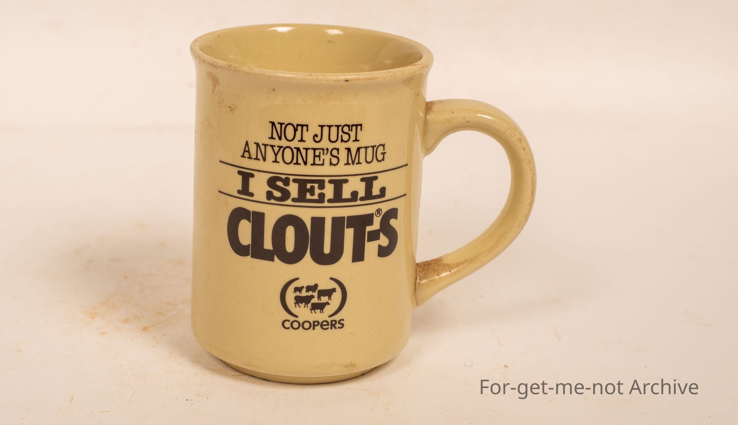 A ceramic mug advertising. I sell clout S, which was a treatment for sheep lice