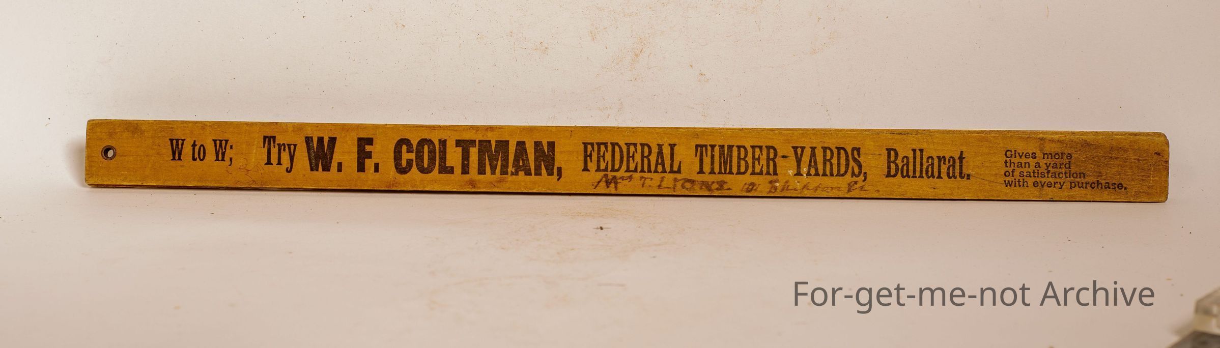 Wooden ruler from Federal Timber Yards Ballarat, WF Coltman, another extremely rare Ballarat Advertising Piece.