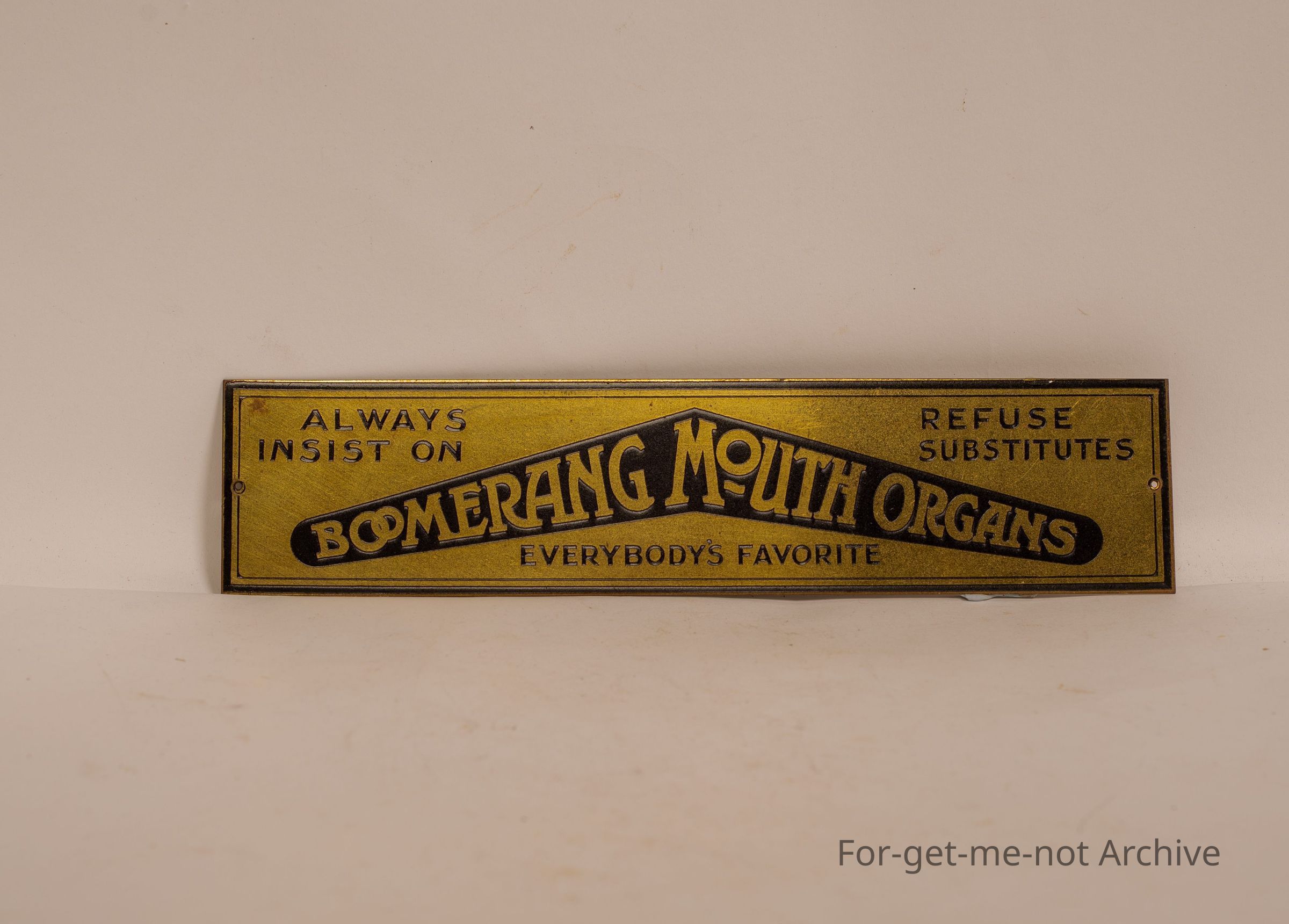 A brass advertising piece for boomerang mouth organs, everyone's Favorite, beautiful condition