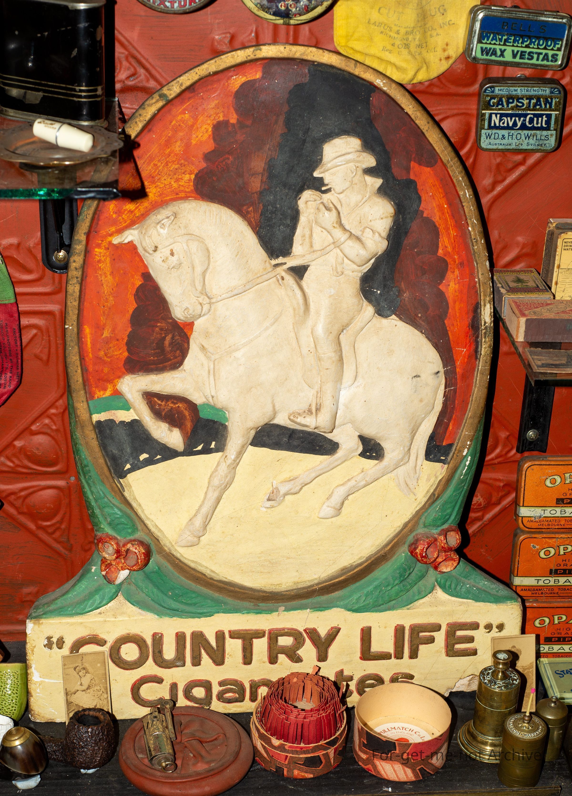 Is a large plaster advertising piece for Country Life Cigarettes with a horseman lighting a smoke while in the saddle. A beautiful piece in excellent condition,