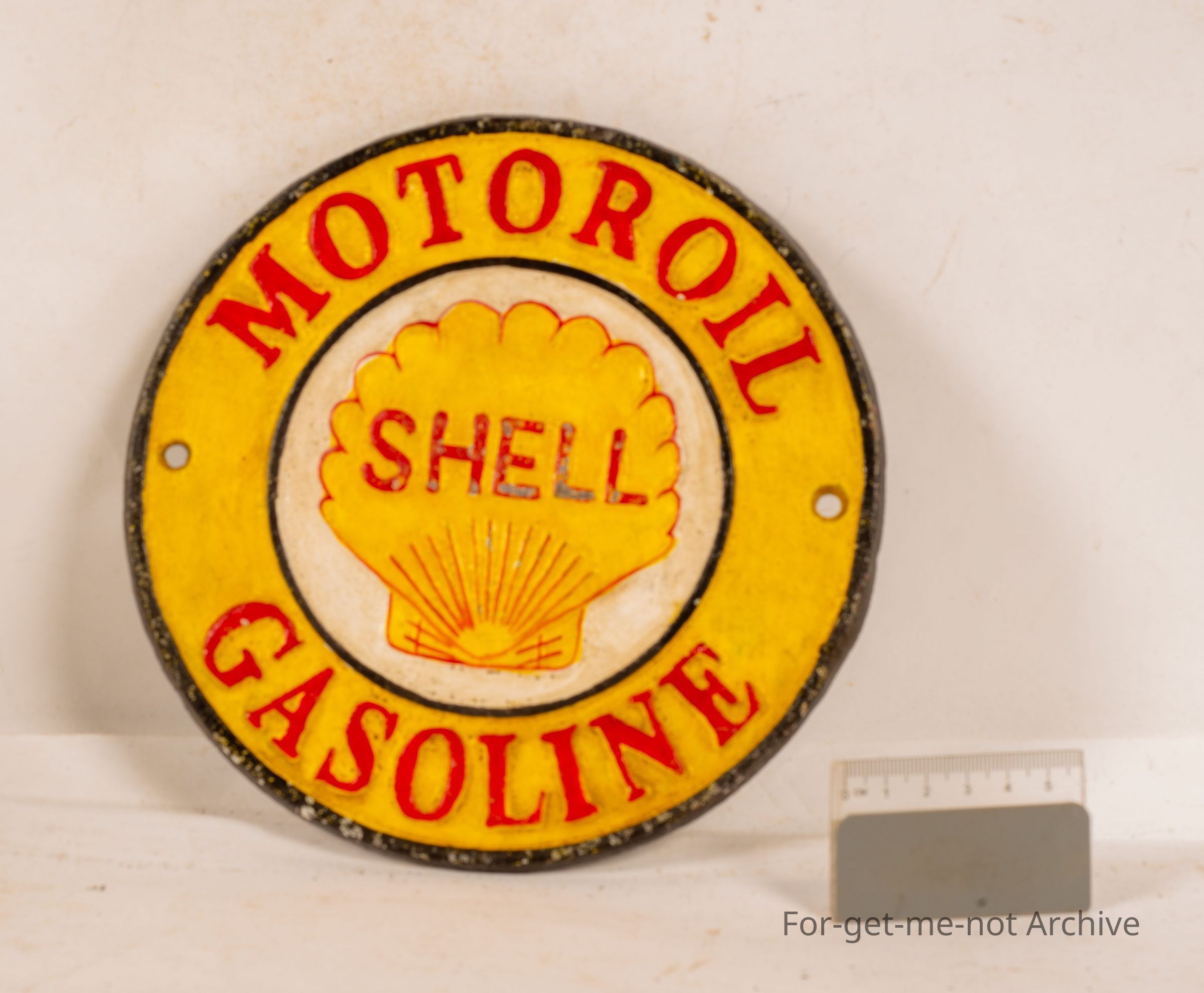 Sangeet Collection. A cast iron plaque. This one advertising motor oil, gasoline from Shell. These are all painted in good condition.