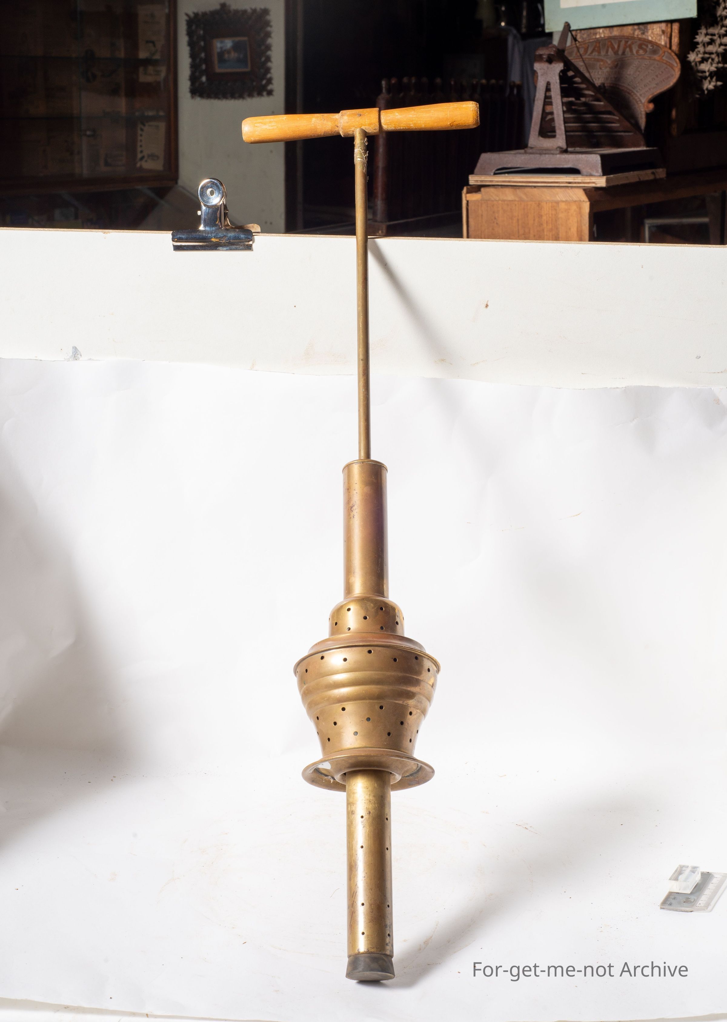 This is from the laundry. It is a spring loaded agitator used in a, probably, a concrete trough. Has a handle which you push up and down to create turbulence through the water, which comes out a series of perforation holes, to disperse the dirt from material.Collection