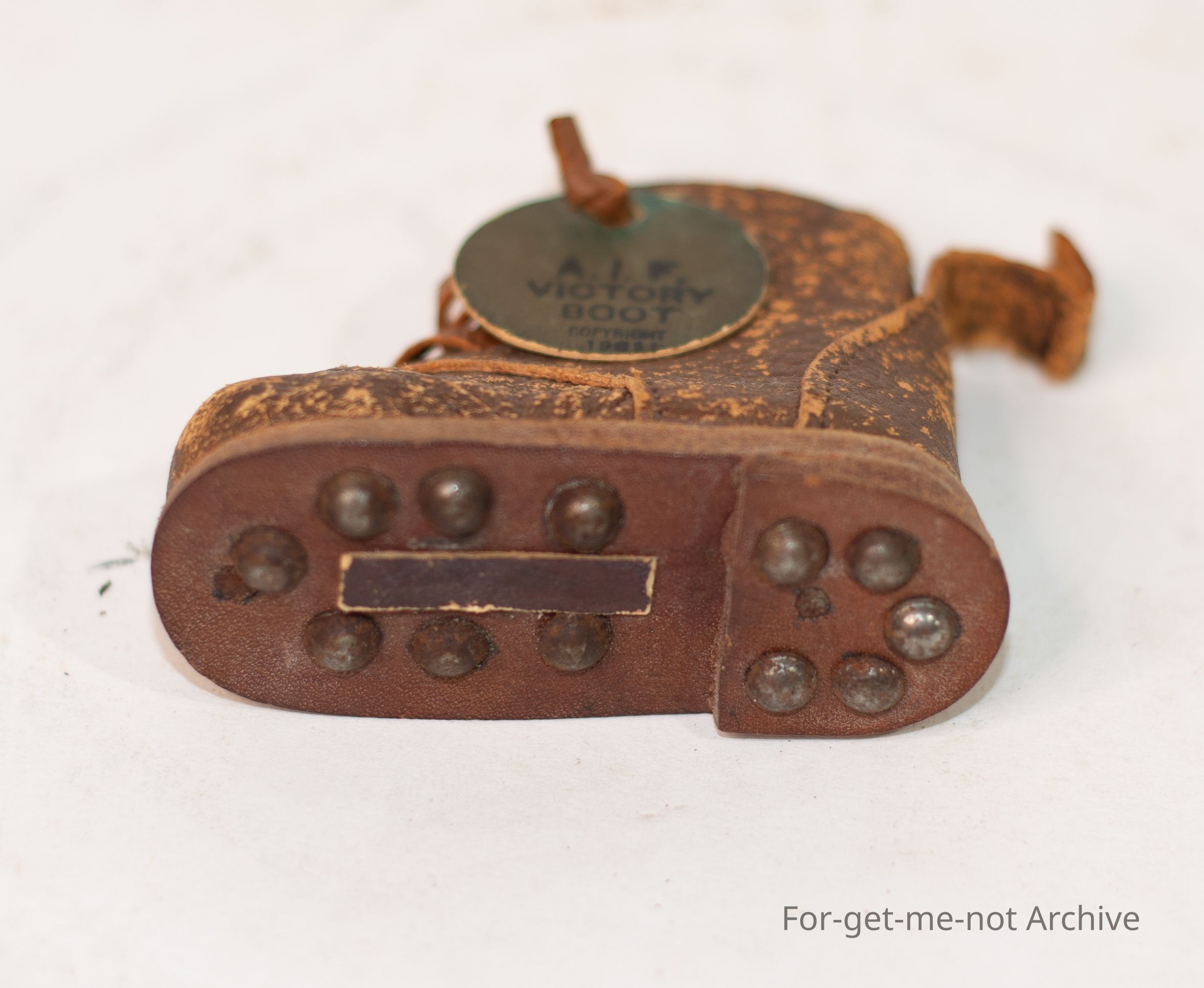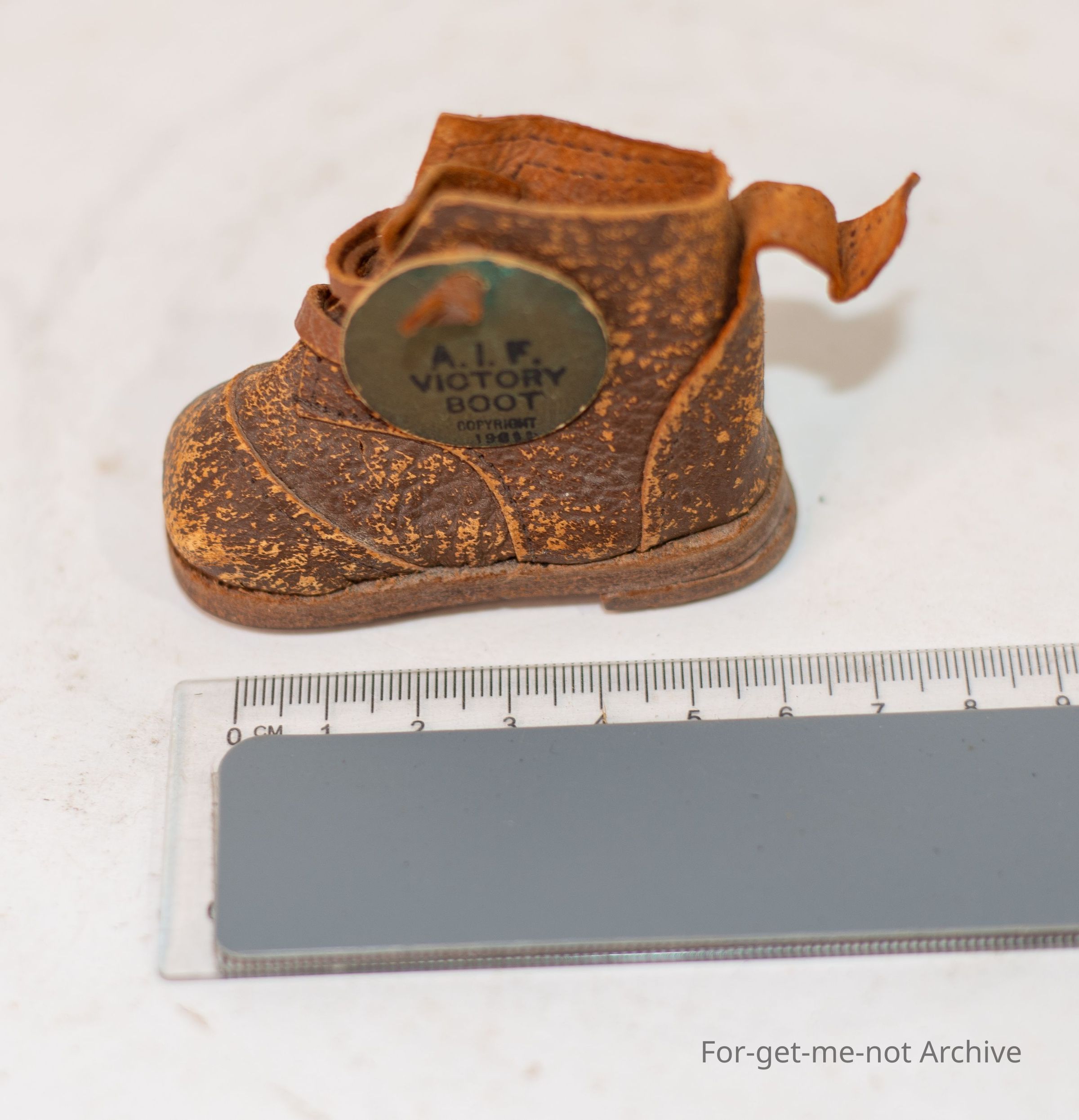This is a fund raising item for the AIF ( Australian Imperial Forces) This boot in great condition and still has its striker underneath. They were marketed from march 1940 by larger retail stores for 1/6d and 2 shillings