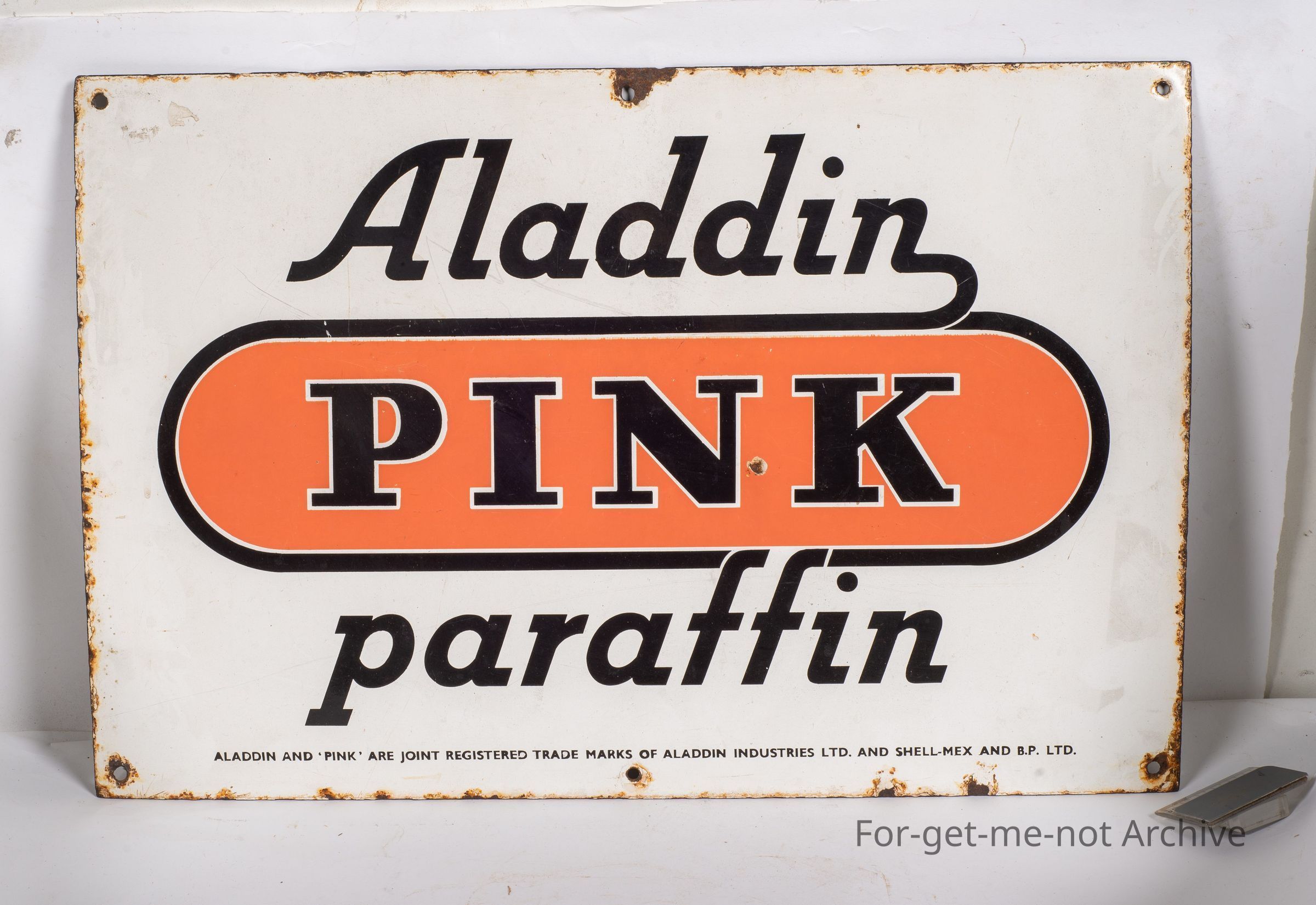 Sangeet Collection, This one is advertising Aladdin Pink Paraffin which was kerosene for Aladdin Lamps, in very good order.